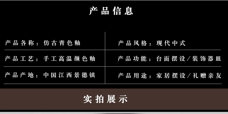 【關于瑕疵】: ◎陶瓷均為手工制品,泥質火燒。無法到達機械制品那般的好,因此不排除會有少許針眼幾瑕疵存在,這也是陶瓷手工品的特點! 【關于色差】: ◎所有商品圖片及細節圖均為實物拍攝,但不排除因顯示器顯示效果的不同導致顏色差異的現象出現,少許的色差難以避免。若對顏色很苛刻的人請慎重考慮! 【關于】: 【關于破損】: ◎在一般情況下99%是不會有破損的問題.但是,如果萬一出了破碎情況的話,請您不要慌張,您先放心的簽收寶貝,然后將破損的圖片24小時內發給我們的客服,我們會為您免費補發一份:所以收到貨了,請拆開您的物品------ ![]() ![]() ![]() |