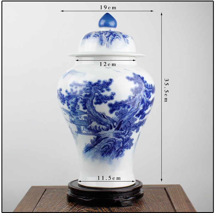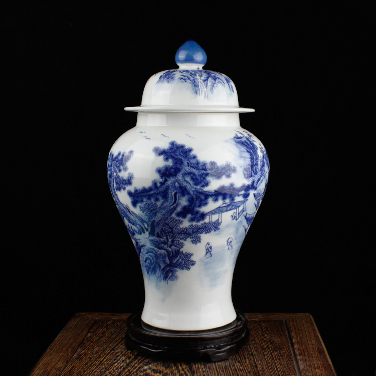 青花瓷山水景德鎮陶瓷器 青花瓷山水畫蔣軍罐儲蓄罐茶葉罐 居家裝飾工藝擺件