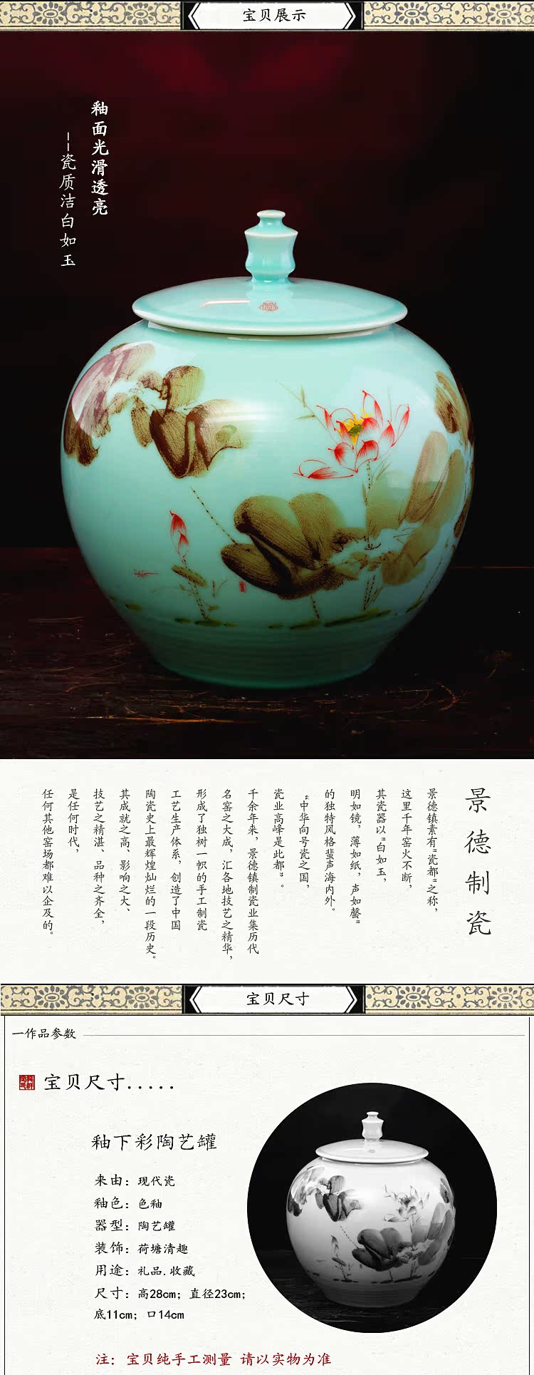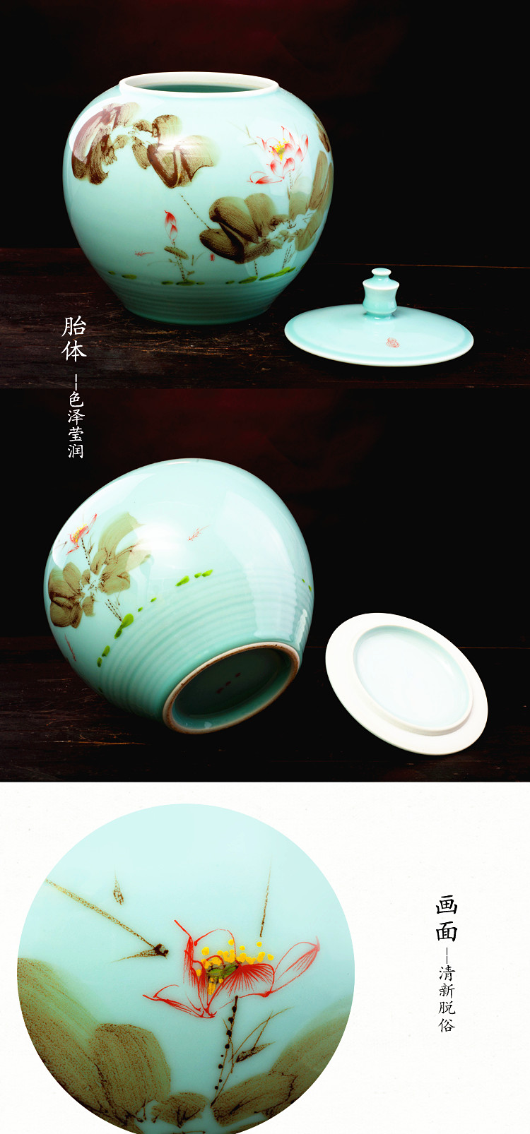 名家手繪荷花豆青蓋罐茶葉罐 景德鎮花瓶陶瓷器擺件現代家居裝飾