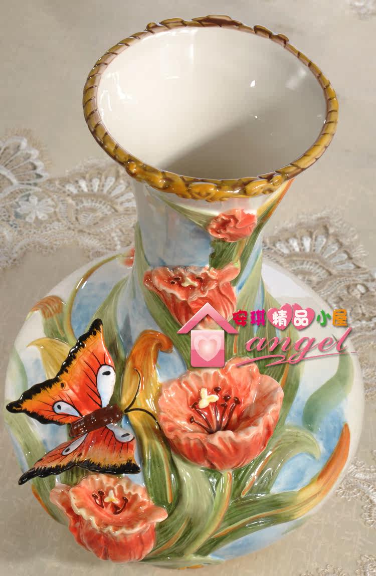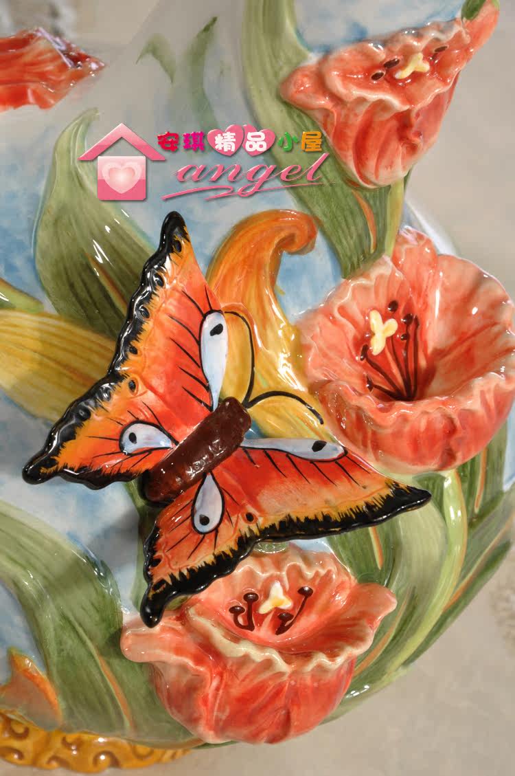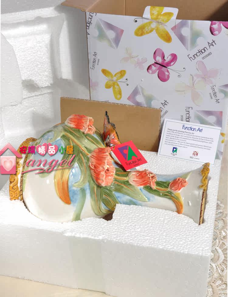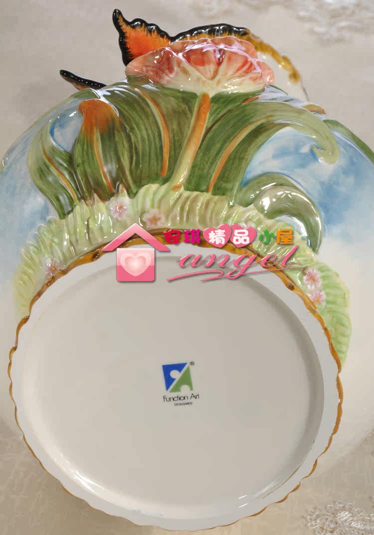 【介紹】:釉下彩繪陶瓷雕刻烤制而成。純手工彩繪加浮雕花,風格獨特,適用家居很溫馨的喲!底部有LOGO標,原品牌彩盒包裝,送禮很適合。