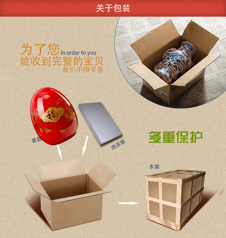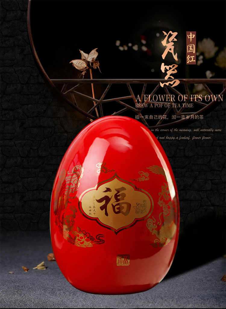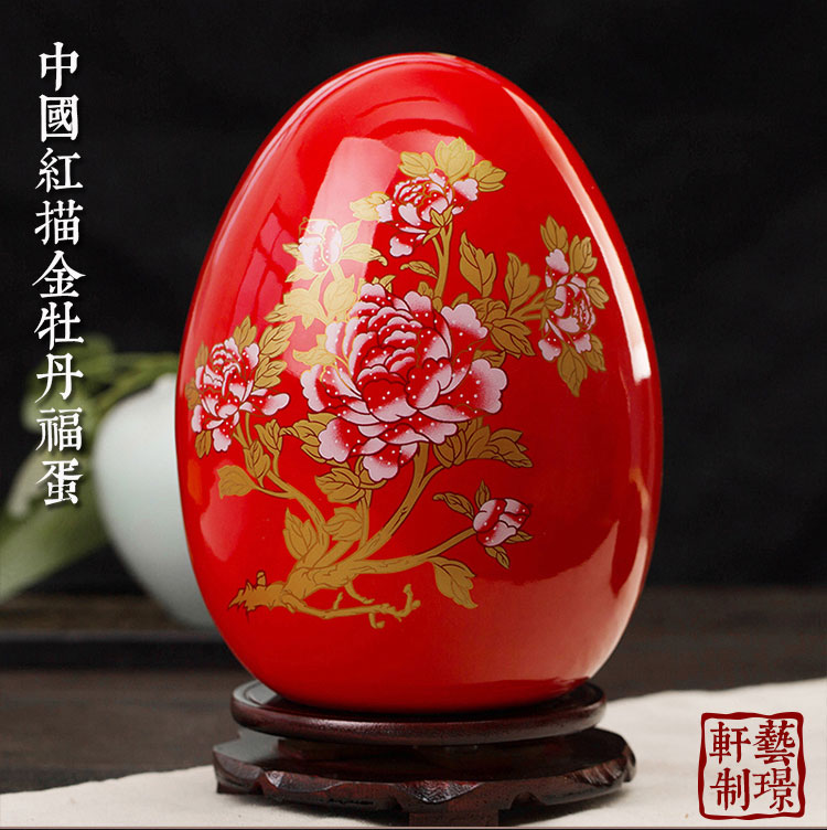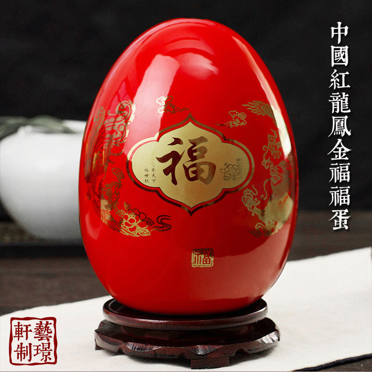 小號招財進寶福蛋+底座景德鎮花瓶 瓷器擺件 民族紅陶瓷福蛋電視柜擺設客廳裝飾工藝品