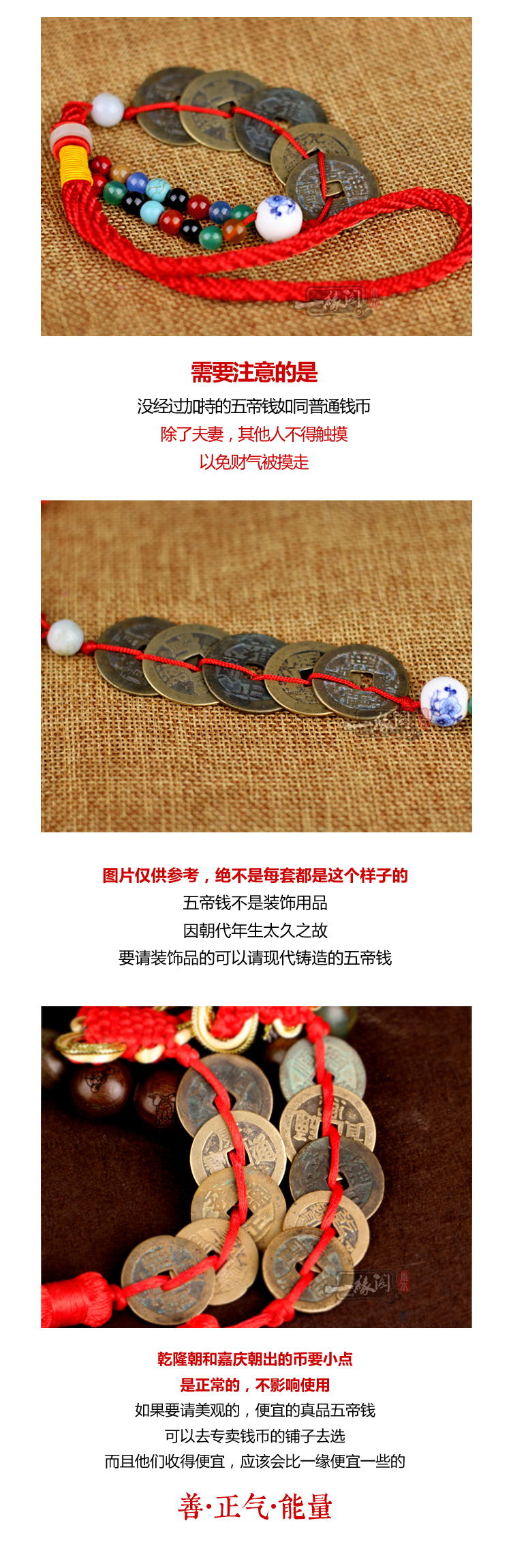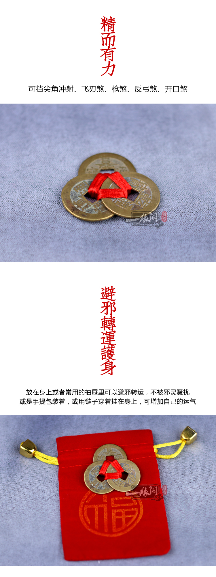 五帝錢使用方法不同,所以穿制材質不同不同材質穿制效果圖請與客服索要 中國結穿制五帝錢懸掛使用 手把繩穿制五帝錢懸掛近身攜帶都可 紅繩穿制五帝錢懸掛近身攜帶都可五色線穿制五帝錢懸掛近身攜帶都可紅繩穿制五帝梅花錢樣式近身攜帶方便放于錢包內紅繩穿制五帝梅花錢樣式近身攜帶方便放于錢包內 五帝錢乃清朝國運最昌盛的五朝制錢。自開國順治以后的五個皇帝,可謂運氣最好。 把五帝錢放在門檻內,可擋尖角沖射、飛刃煞、槍煞、反弓煞、開口煞;放在身上或者常用的抽屜里可以避邪,不被邪靈騷擾,或利是手提包裝著,或用繩穿著掛在頸上,可增加自己的運氣。放在錢包里可助旺財運,增強賭運。經過多次使用,非常靈驗。 由于真品五帝錢的特性,故必須要真真正正的順,康,雍,乾,嘉時期銅錢,仿制和假冒無效。 緣主朋友注意:五帝錢雖屬催財運,鎮邪惡,保平安至寶,但因其本身屬金,故不適合命中忌金之人佩帶。命中忌金之人若帶之不僅不能轉好運,甚至會處處碰壁,見財化水,疾病官司纏身 這個五行指的是出生的這一天,的天干,并不是大家在外面買的娛樂書上說的,哪一年屬什么什么的.因為土多金埋,土薄金雜 ,薄土不生強金。 另要注意的是,五帝錢必須要全真才可發揮最大功效,若有現代錢,仿造錢,鑄造錢混雜其中,則其效力微。沒經過加持的如同普通錢幣。 |
