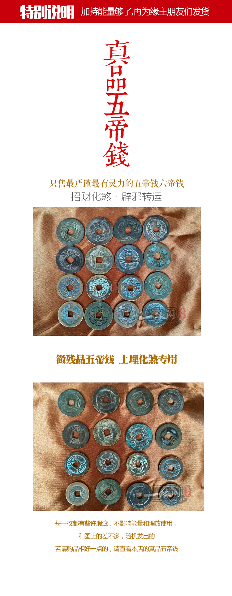 本公司大部分商品6一10天到貨。不接急單。急單的客戶請不要下單。感謝諒解與合作!![]() ![]() ![]() 催財化煞至寶/五帝錢/轉運功能神奇/已開光加持 直接拍下寶貝請備注穿制的材質,加持時間夠了,再為緣主朋友們 有些店家說五帝錢不需要開光,因為五帝錢不屬于任何宗教,這里我不做評論,一緣的真品五帝錢經過了開光加持,能量自然夠了。每一枚錢幣都是不一樣的,圖片僅供參考,一緣會隨緣發出,先發加持能量夠了品相好的。刻意追求超完美主義者勿拍。阿彌陀佛!