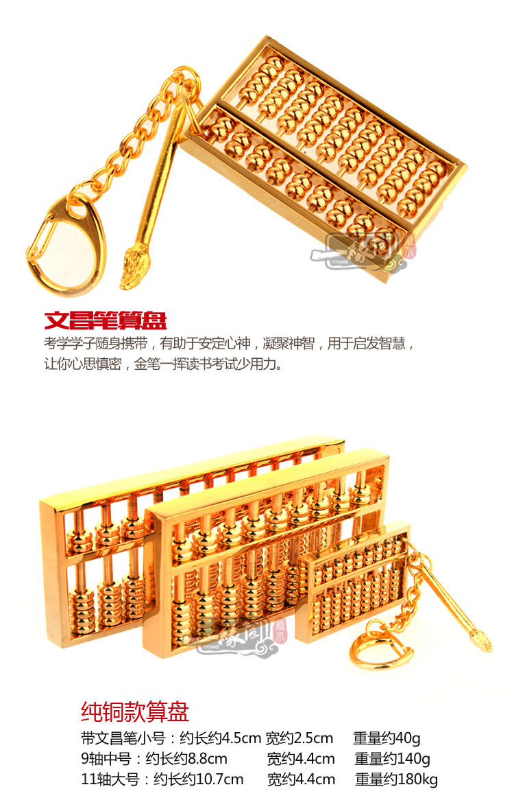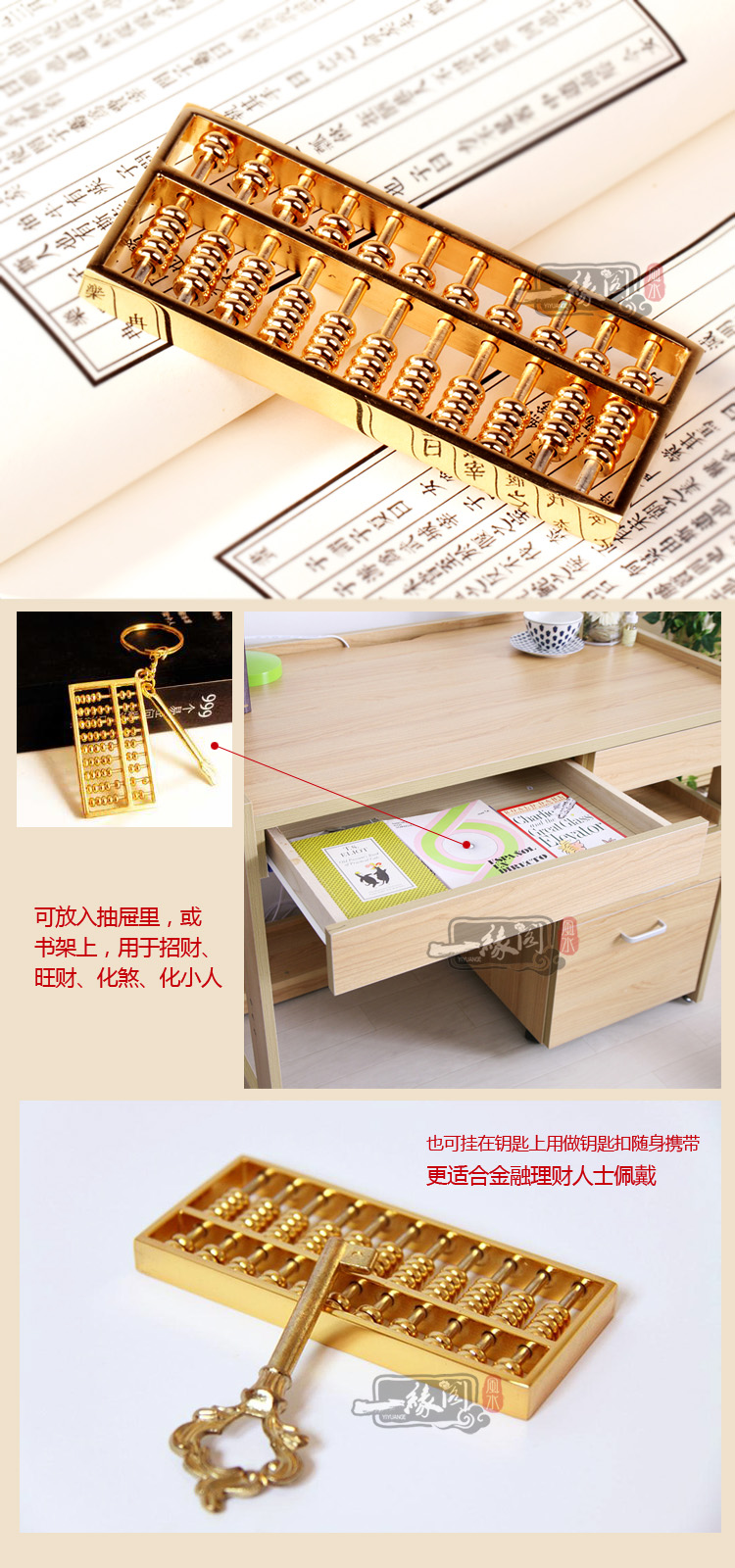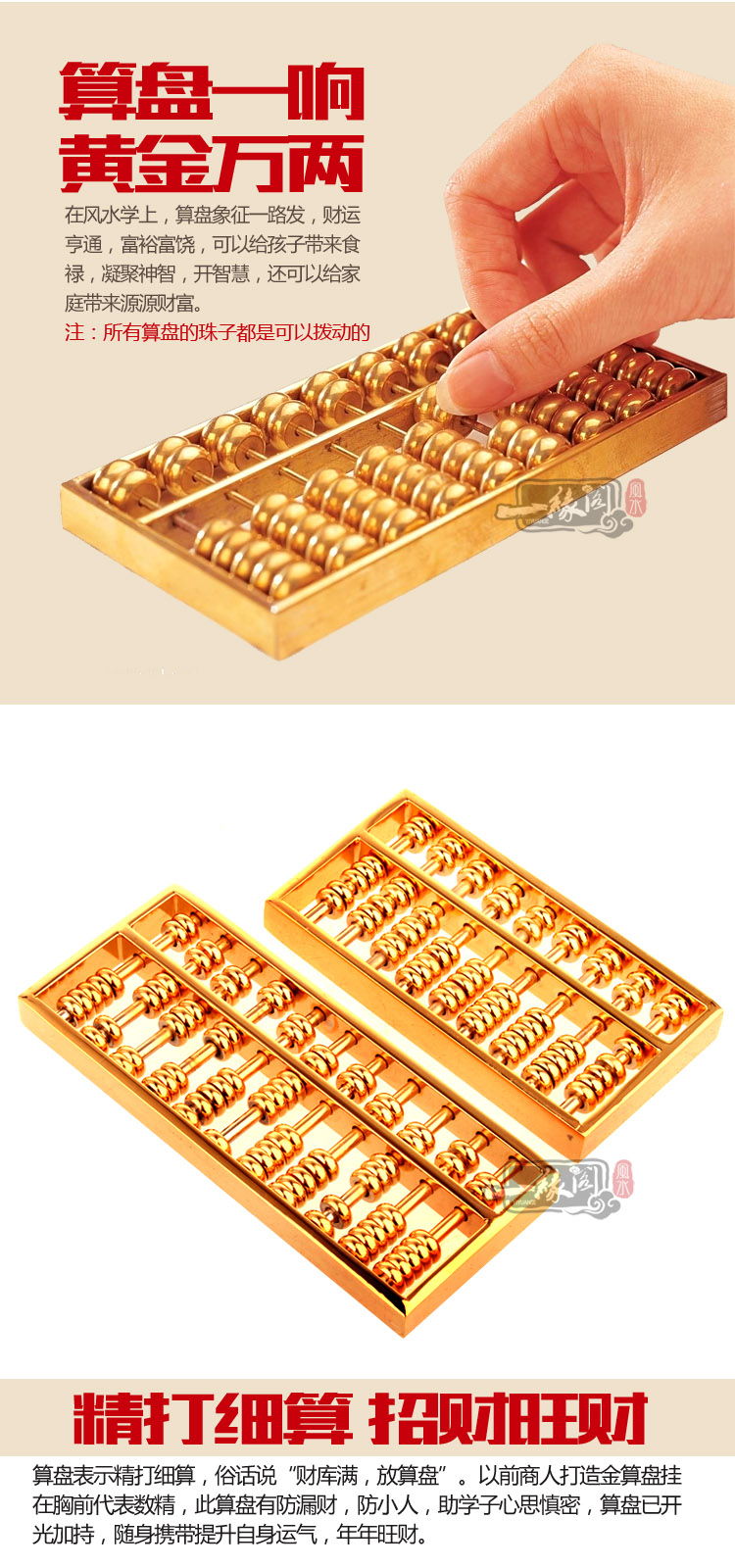 算盤表示精打細算,俗話說“財庫,放算盤”。以前商人打造金算盤,掛在胸口代表數精。隨身攜帶提升自身運勢,年年旺財。考學學子攜帶,心思慎密,讀書考試少用力,同時也是化煞招財風水陣,鎮壓小人使小人不易侵犯。適用人群較廣,希望有儲蓄的人經常會感到自己漏財及儲不到錢,算盤是防止漏財的,同時也是化小人招貴人的常用風水法器. 銅算盤常用于、、商業留易、金融、財務、公務員人員等人士旺財招財之用。可放在命主的抽屜內,另外也可以掛在門上、窗上或者書架上用于招財旺財、化煞化解小人。除可隨身攜帶放在包里或者掛在鑰匙上,也可放在辦公桌子上。俗語說:如意算盤打得響,金銀財寶滾滾來!所以算盤在實質上象征了財利,凡做生意的都相信在每天一大早開始營業時,一定要先敲打算盤,象征一整天下來都會客似云來,算盤會一直操作不停,銀子金子就自然往店里流! 若門前犯了煞氣或門外或者窗外對著電線桿,可以利用算盤化解,否則電線桿等形成的六煞水會對宅主人健康及事業造成負面之影響。算盤在風水上,也起了趨吉避兇的力量。算盤之所以用來作風水用品,因為算盤子是圓的,在風水學中,圓的物體在一些關鍵時候,能有消解煞氣的力量。 |