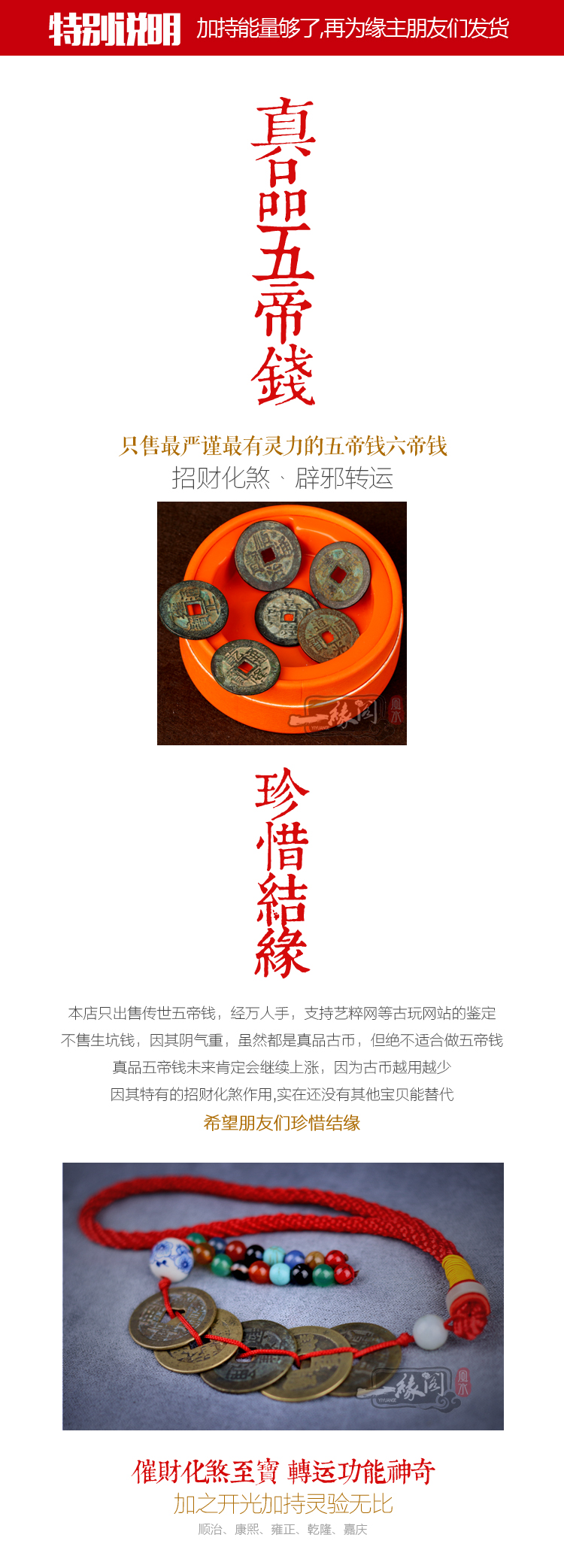 本公司大部分商品6一10天到貨。不接急單。急單的客戶請不要下單。感謝諒解與合作!![]() ![]() ![]() ![]() ![]() ![]() ![]() ![]() ![]() ![]() ![]() ![]() ![]() 催財化煞至寶/五帝錢/轉運功能神奇/已開光加持 若需加強加持請與一緣聯系,直接拍下寶貝,加持時間夠了,再為緣主朋友們 有些店家說五帝錢不需要開光,因為五帝錢不屬于任何宗教,這里我不做評論,一緣的真品五帝錢經過了開光加持,能量自然夠了。每一枚錢幣都是不一樣的,圖片僅供參考,一緣會隨緣發出,先發加持能量夠了品相好的。刻意追求超完美主義者勿拍。阿彌陀佛!