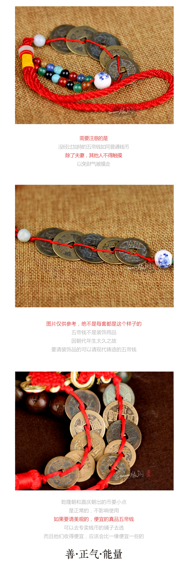 五帝錢乃清朝國運最昌盛的五朝制錢。自開國順治以后的五個皇帝,可謂運氣最好。 把五帝錢放在門檻內,可擋尖角沖射、飛刃煞、槍煞、反弓煞、開口煞;放在身上或者常用的抽屜里可以避邪,不被邪靈騷擾,或利是手提包裝著,或用繩穿著掛在頸上,可增加自己的運氣。放在錢包里可助旺財運,增強賭運。經過多次使用,非常靈驗。 由于五帝錢的特性,故必須要真真正正的順,康,雍,乾,嘉時期銅錢,仿制和假冒無效。 又因為真雍正不好找,市面上一個真雍正價格7899在40到50以上。故最不好早。也最難配齊,配齊后又要掛在吐財瑞獸三腳金蟾上加持能量3-49天。數量有限啊。 市面上有很多現代鑄造和仿造的五帝錢,應不具備三才之氣,故不可用做風水轉運物 因為土多金埋,土薄金雜 ,薄土不生強金 緣主朋友注意:五帝錢雖屬催財運,鎮邪惡,保平安至寶,但因其本身屬金,故不適合命中忌金之人佩帶。命中忌金之人若帶之不僅不能轉好運,甚至會處處碰壁,見財化水,疾病官司纏身 這個五行指的是出生的這一天,的天干,并不是大家在外面買的娛樂書上說的,哪一年屬什么什么的. 另要注意的是,五帝錢必須要全真才可發揮最大功效,若有現代錢,仿造錢,鑄造錢混雜其中,則其效力微。沒經過加持的如同普通錢幣。 |