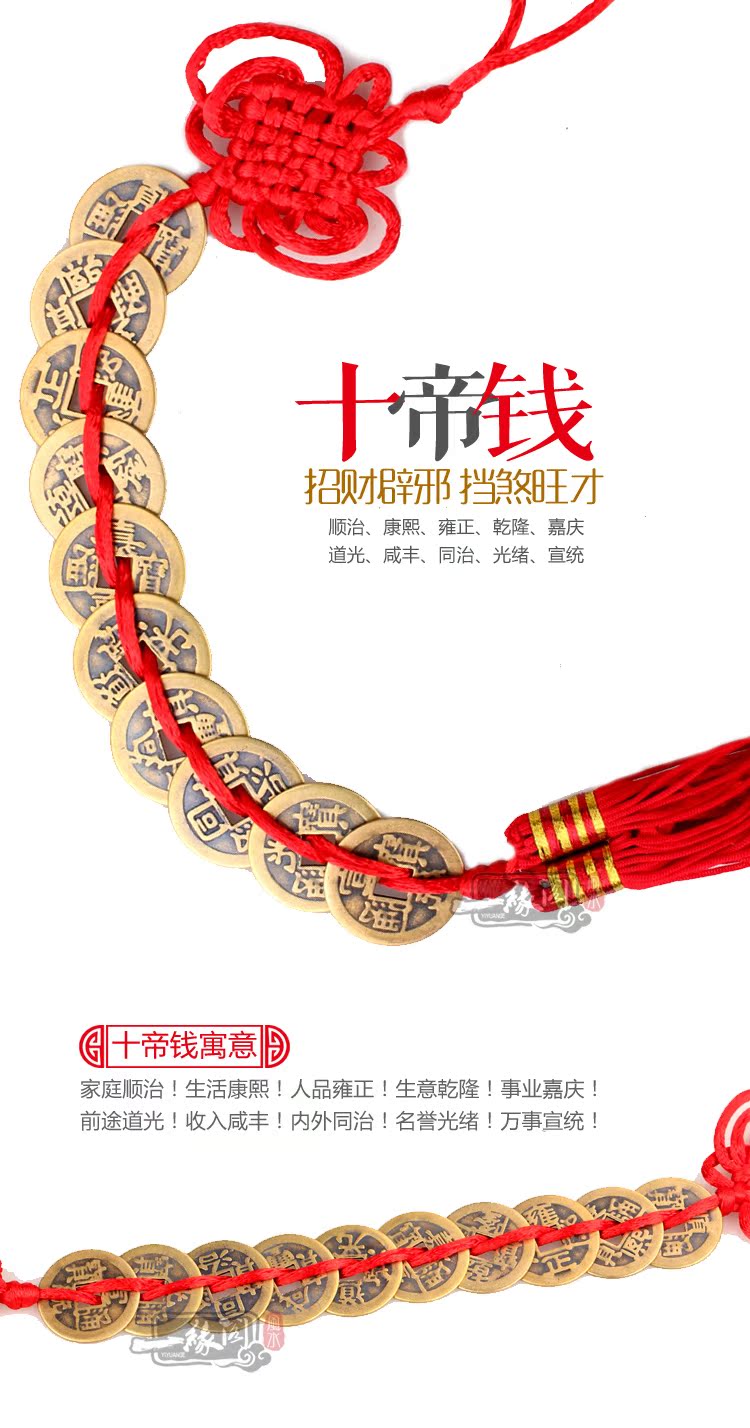 十帝:順治、康熙、雍正、乾隆、嘉慶、道光、咸豐、同治、光緒、宣統。可擋煞、避邪旺才. 把十帝錢放在門檻內,可擋尖角沖射、飛刃煞、槍煞、反弓煞、開口煞;放在身上可以避邪,不被邪靈騷擾,或用利是封包裝著,或用繩穿著掛在頸上,可增加自己的運氣。