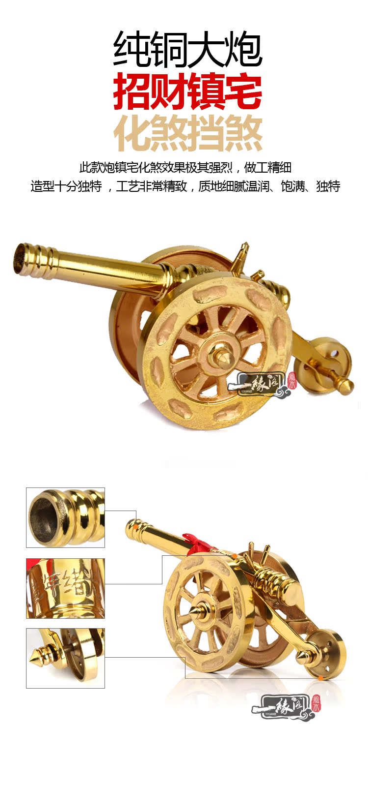 此款炮鎮宅化煞效果極其強烈,做工精細,造型十分獨特 ,工藝非常精致,質地細膩溫潤、飽、獨特。明清時期,大炮威力強大,無堅不摧,曾經是一個國家力量強大的體現。就因為大炮威猛強大,現今民間把大炮用作 鎮宅辟邪、化煞擋煞。大炮吉祥物為結合傳統風水與現在科學武器為一體的重要體現!把炮口對準屋外有煞的地方,就能鎮宅化煞。