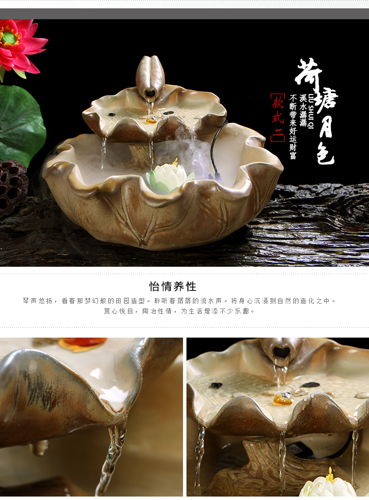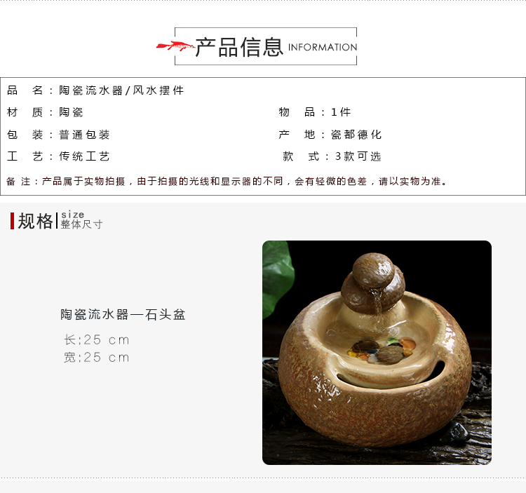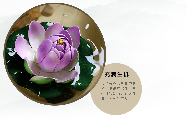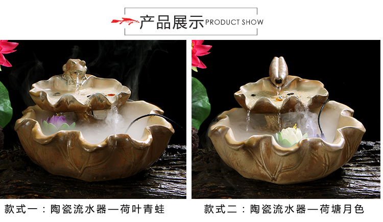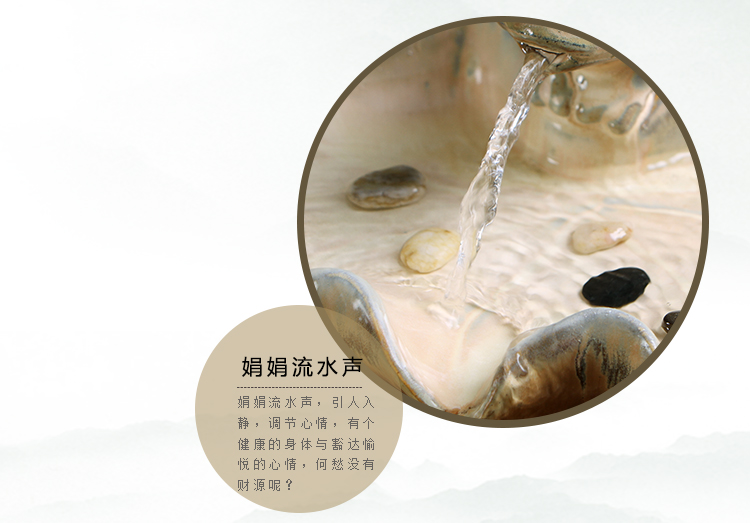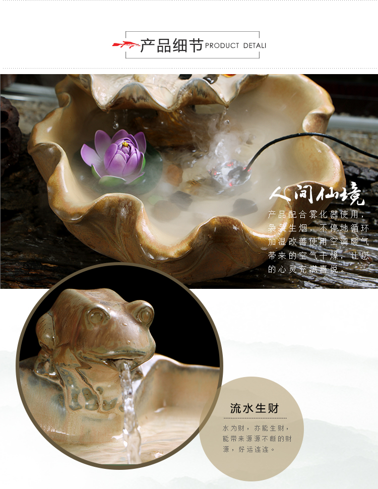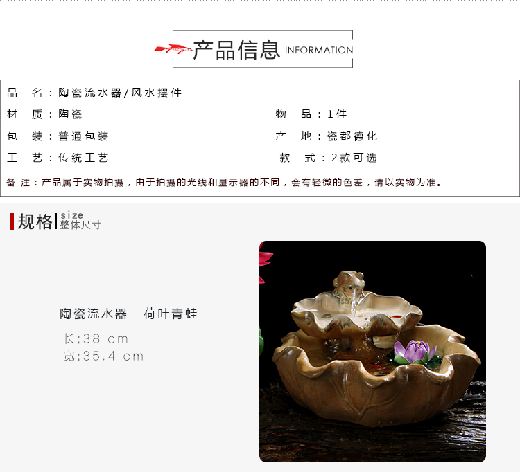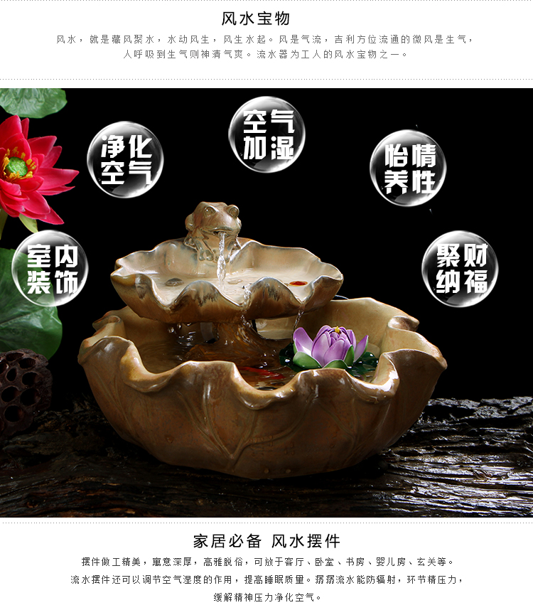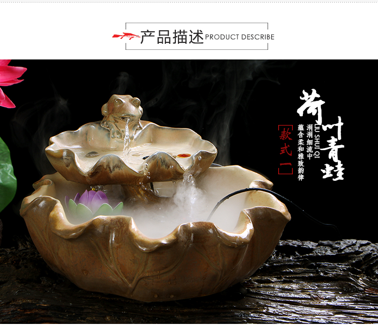 | 本公司大部分商品6一10天到貨。不接急單。急單的客戶請不要下單。感謝諒解與合作! 無需擔心快遞運輸破損問題,如有意外損壞,也由全部負責,并即時補發。 還免費贈送適量天然鵝卵石,如有需要請與客服聯系。 【名稱】荷葉青蛙流水器 【材質】陶瓷 【產地】瓷都—德化 【包裝】普通包裝 奇特的噴水變幻過程中,產生的大量負氧離子,粉塵結合,將其吸附于水中沉淀,能有效驅除二手煙、甲醛、一氧化碳,水中滴入植物,將會室生香,有養神、美顏保健的功效。濕潤的空氣能使人保持生機盎然,避免皮膚干燥、眼睛干澀。能舒緩神經緊張,消除疲勞,保持容光煥發。同時也起到很高的觀賞裝飾作用和實用價值。特別是空調房間和干燥氣候尤其適用!獨特的產品,回歸大自然的境象,讓人有一種處于世外桃源的感覺,還有一股潺潺流水聲,更為你的家居擺設增添了一份生機。陶瓷噴泉是少有的能把觀賞性和實用性相結合的陶瓷工藝品,是單位開業、親友喬遷、新居落成之饋贈佳品。同時適用于辦公室、大廳等公共場所的空氣凈化作用。 使用范圍:開業慶典,展廳擺件店面裝飾花園擺件房地產別墅擺件酒店大堂客廳裝飾品園林假山池塘擺件