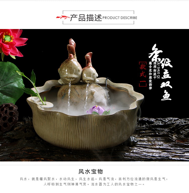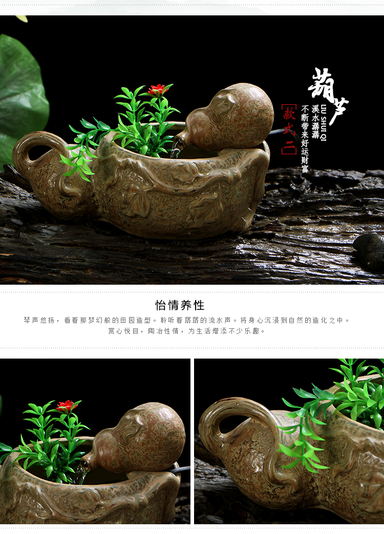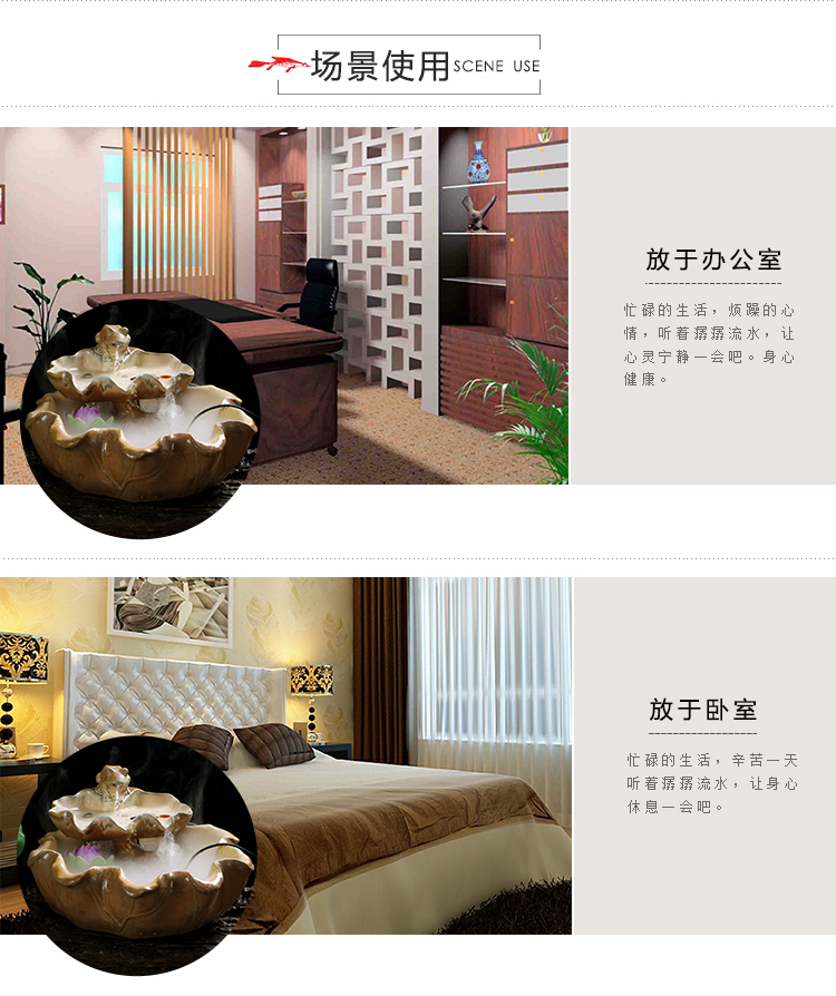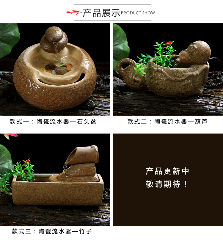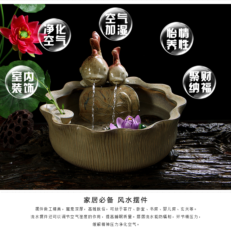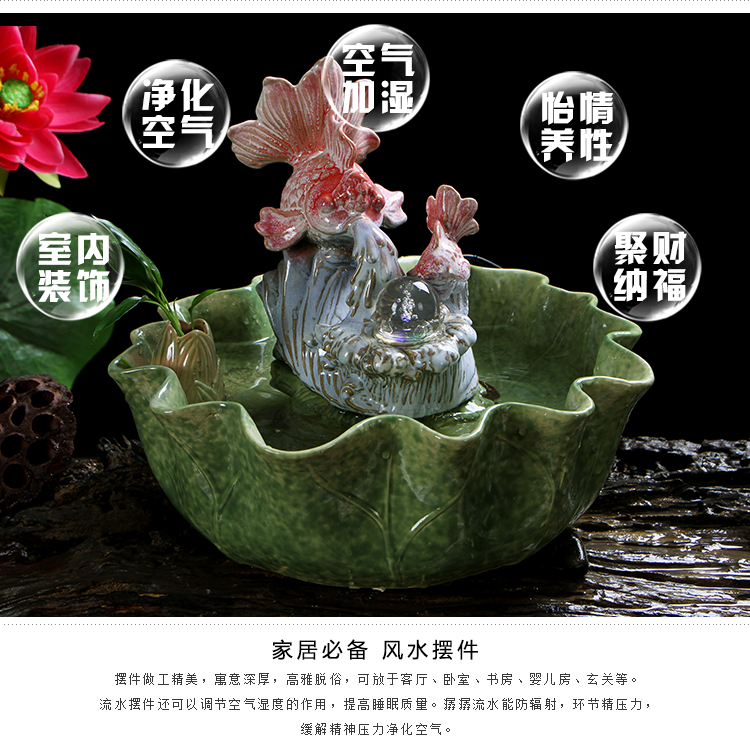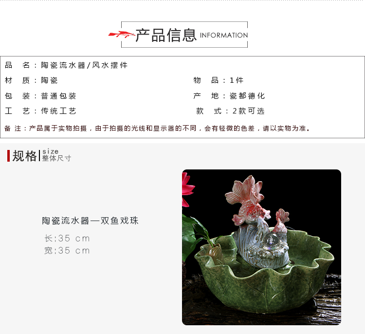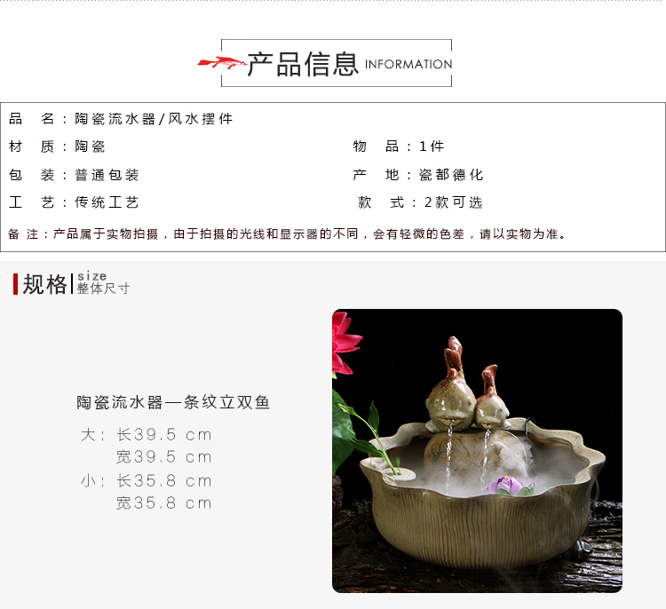 | 本公司大部分商品6一10天到貨。不接急單。急單的客戶請不要下單。感謝諒解與合作! 無需擔心快遞運輸破損問題,如有意外損壞,也由全部負責,并即時補發。 還免費贈送適量天然鵝卵石,如有需要請與客服聯系。 【名稱】荷葉青蛙流水器 【材質】陶瓷 【產地】瓷都—德化 【包裝】普通包裝 奇特的噴水變幻過程中,產生的大量負氧離子,粉塵結合,將其吸附于水中沉淀,能有效驅除二手煙、甲醛、一氧化碳,水中滴入植物,將會室生香,有養神、美顏保健的功效。濕潤的空氣能使人保持生機盎然,避免皮膚干燥、眼睛干澀。能舒緩神經緊張,消除疲勞,保持容光煥發。同時也起到很高的觀賞裝飾作用和實用價值。特別是空調房間和干燥氣候尤其適用!獨特的產品,回歸大自然的境象,讓人有一種處于世外桃源的感覺,還有一股潺潺流水聲,更為你的家居擺設增添了一份生機。陶瓷噴泉是少有的能把觀賞性和實用性相結合的陶瓷工藝品,是單位開業、親友喬遷、新居落成之饋贈佳品。同時適用于辦公室、大廳等公共場所的空氣凈化作用。 使用范圍:開業慶典,展廳擺件店面裝飾花園擺件房地產別墅擺件酒店大堂客廳裝飾品園林假山池塘擺件