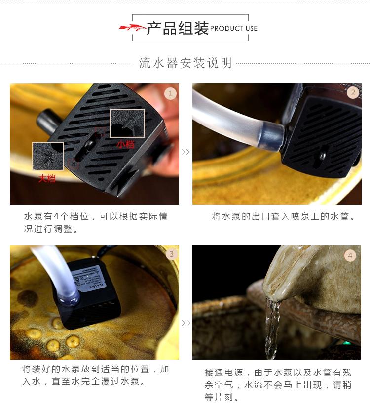 | 本公司大部分商品6一10天到貨。不接急單。急單的客戶請不要下單。感謝諒解與合作! 無需擔心快遞運輸破損問題,如有意外損壞,也由全部負責,并即時補發。 還免費贈送適量天然鵝卵石,如有需要請與客服聯系。 【名稱】青蛙流水器 【材質】陶瓷 【產地】瓷都—德化 【包裝】普通包裝 奇特的噴水變幻過程中,產生的大量負氧離子,粉塵結合,將其吸附于水中沉淀,能有效驅除二手煙、甲醛、一氧化碳,水中滴入植物,將會室生香,有養神、美顏保健的功效。濕潤的空氣能使人保持生機盎然,避免皮膚干燥、眼睛干澀。能舒緩神經緊張,消除疲勞,保持容光煥發。同時也起到很高的觀賞裝飾作用和實用價值。特別是空調房間和干燥氣候尤其適用!獨特的產品,回歸大自然的境象,讓人有一種處于世外桃源的感覺,還有一股潺潺流水聲,更為你的家居擺設增添了一份生機。陶瓷噴泉是少有的能把觀賞性和實用性相結合的陶瓷工藝品,是單位開業、親友喬遷、新居落成之饋贈佳品。同時適用于辦公室、大廳等公共場所的空氣凈化作用。 使用范圍:開業慶典,展廳擺件店面裝飾花園擺件房地產別墅擺件酒店大堂客廳裝飾品園林假山池塘擺件