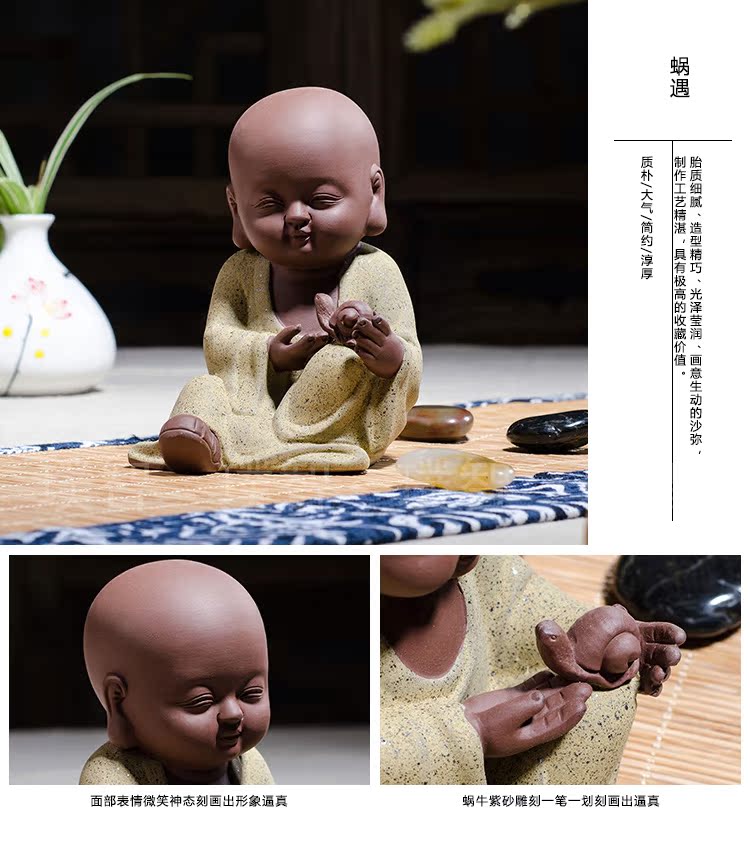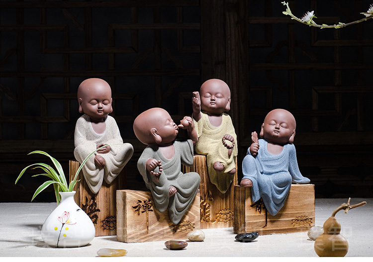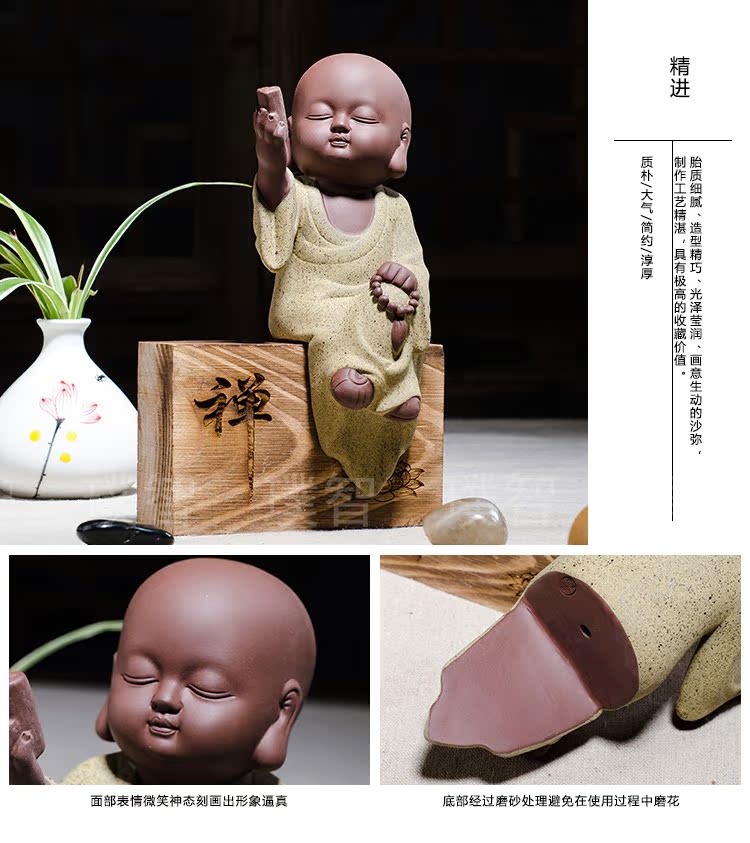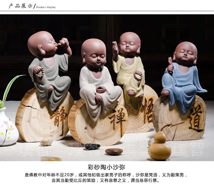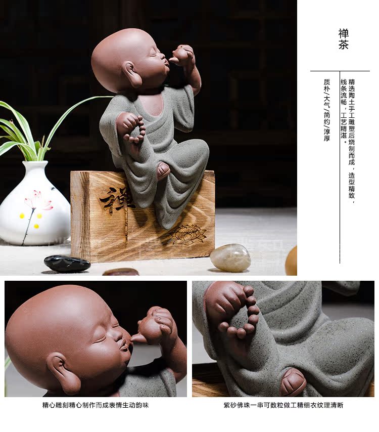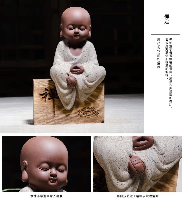 款式四紫砂佛像小沙彌風化木座根雕家居客廳工藝品小和尚陶瓷擺件人物