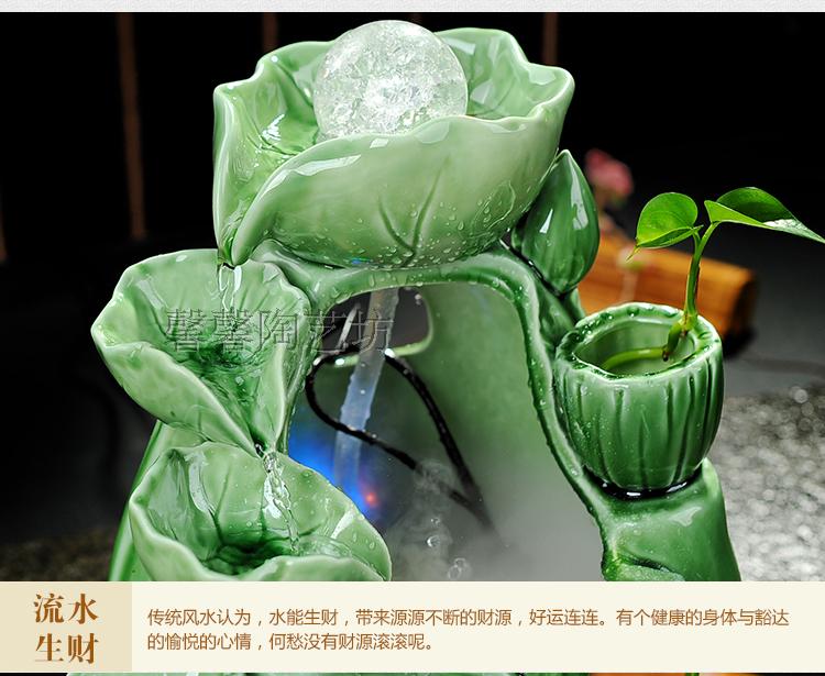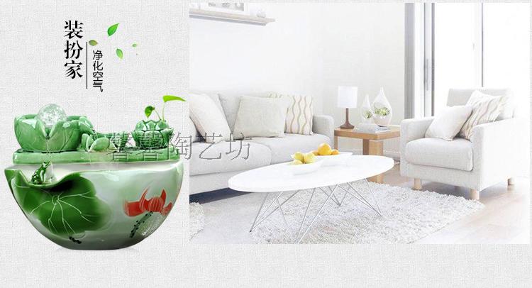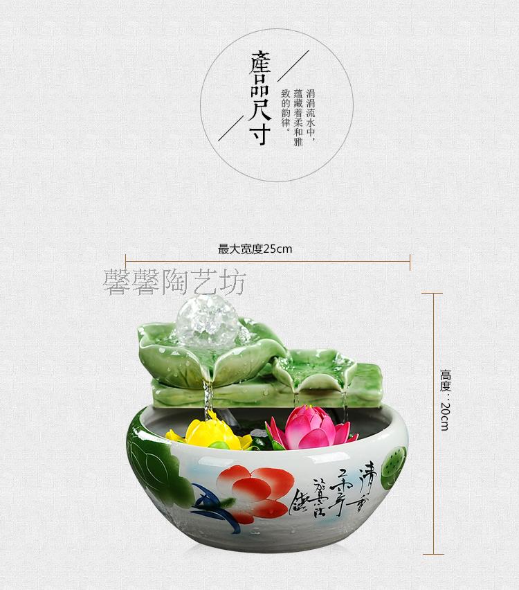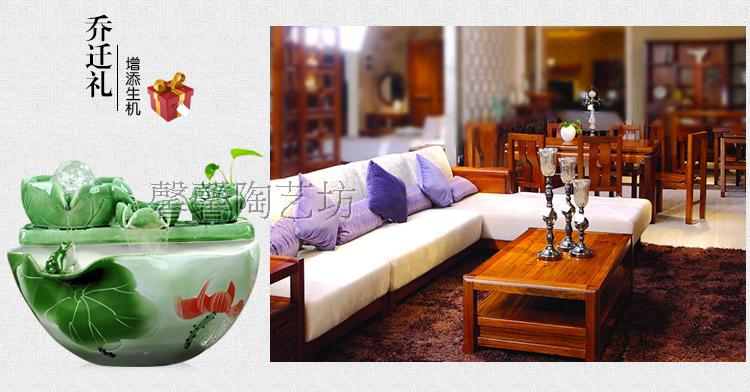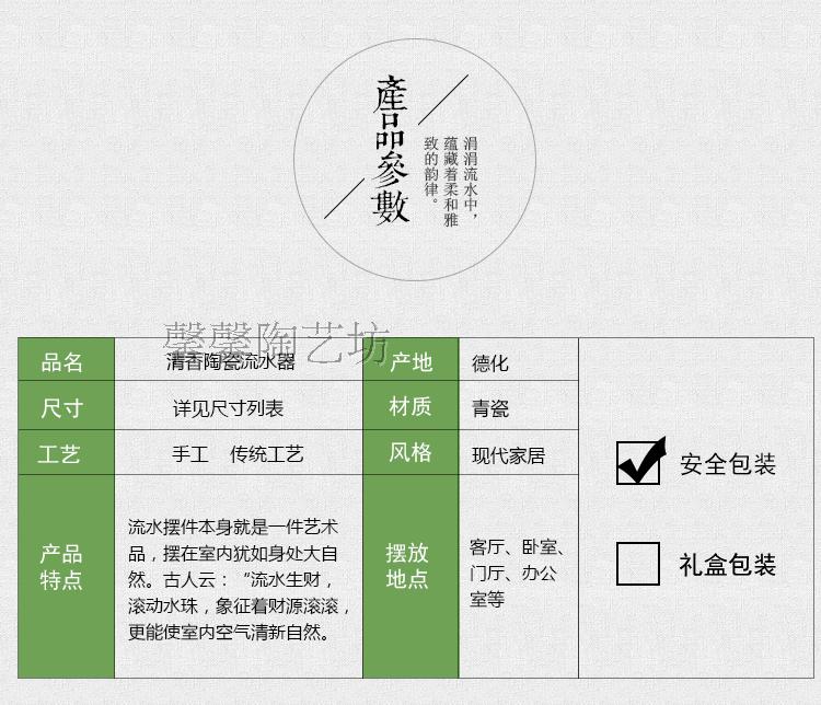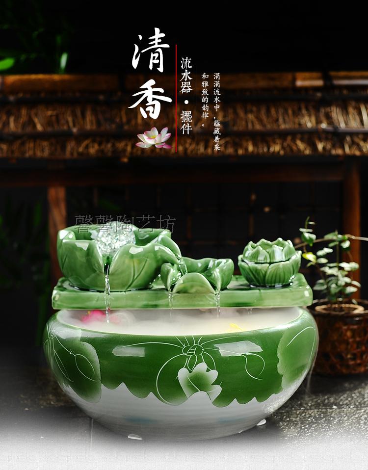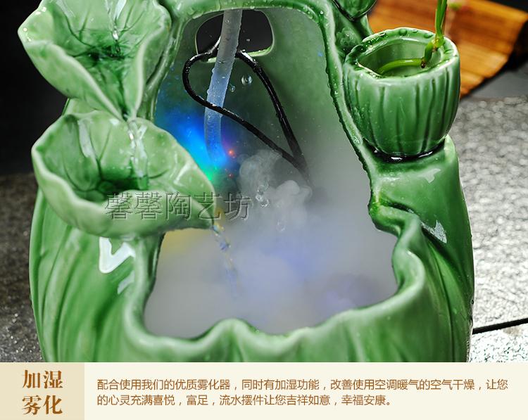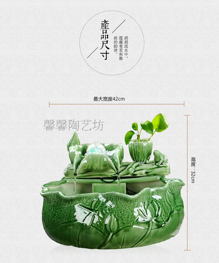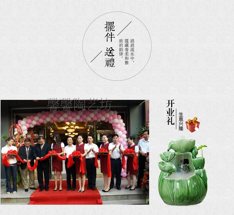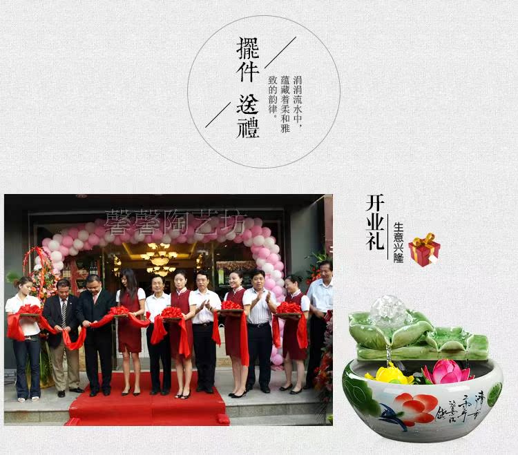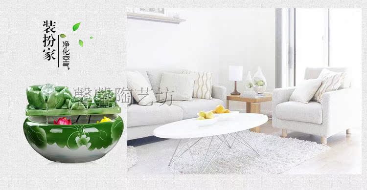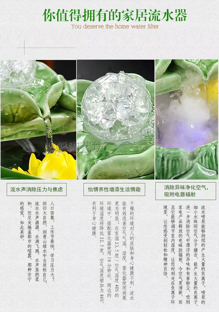 | 本公司大部分商品6一10天到貨。不接急單。急單的客戶請不要下單。感謝諒解與合作! 還免費贈送適量天然鵝卵石,如有需要請與客服聯系。 【名稱】清香流水器 【材質】陶瓷 【套裝】一個水泵 ,贈送兩朵荷花,不包含霧化器,如需霧化器需另拍, 【產地】瓷都—德化 【包裝】普通包裝 奇特的噴水變幻過程中,產生的大量負氧離子,粉塵結合,將其吸附于水中沉淀,能有效驅除二手煙、甲醛、一氧化碳,水中滴入植物,將會室生香,有養神、美顏保健的功效。濕潤的空氣能使人保持生機盎然,避免皮膚干燥、眼睛干澀。能舒緩神經緊張,消除疲勞,保持容光煥發。同時也起到很高的觀賞裝飾作用和實用價值。特別是空調房間和干燥氣候尤其適用!獨特的產品,回歸大自然的境象,讓人有一種處于世外桃源的感覺,還有一股潺潺流水聲,更為你的家居擺設增添了一份生機。陶瓷噴泉是少有的能把觀賞性和實用性相結合的陶瓷工藝品,是單位開業、親友喬遷、新居落成之饋贈佳品。同時適用于辦公室、大廳等公共場所的空氣凈化作用。 使用范圍:開業慶典,展廳擺件店面裝飾花園擺件房地產別墅擺件酒店大堂客廳裝飾品園林假山池塘擺件