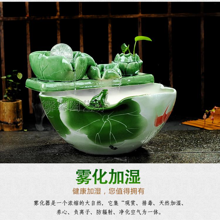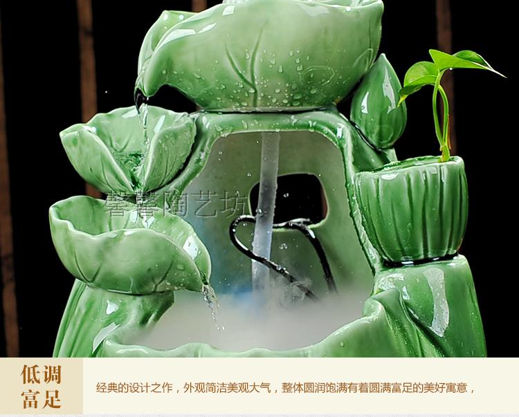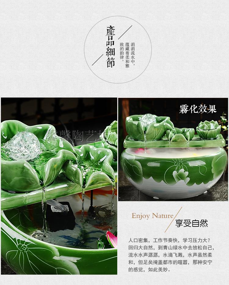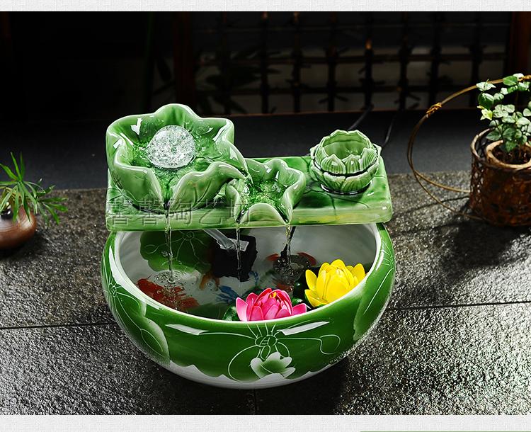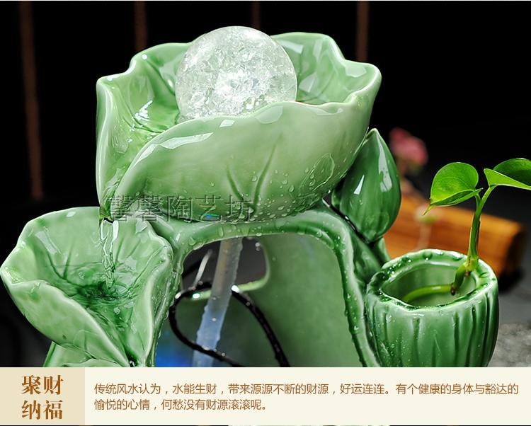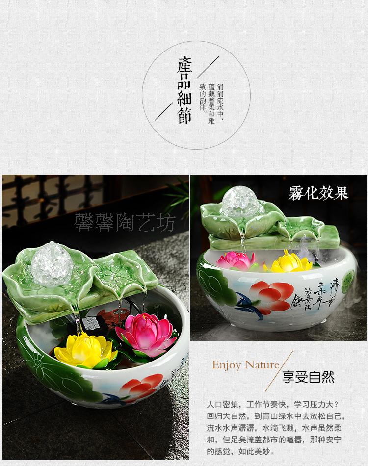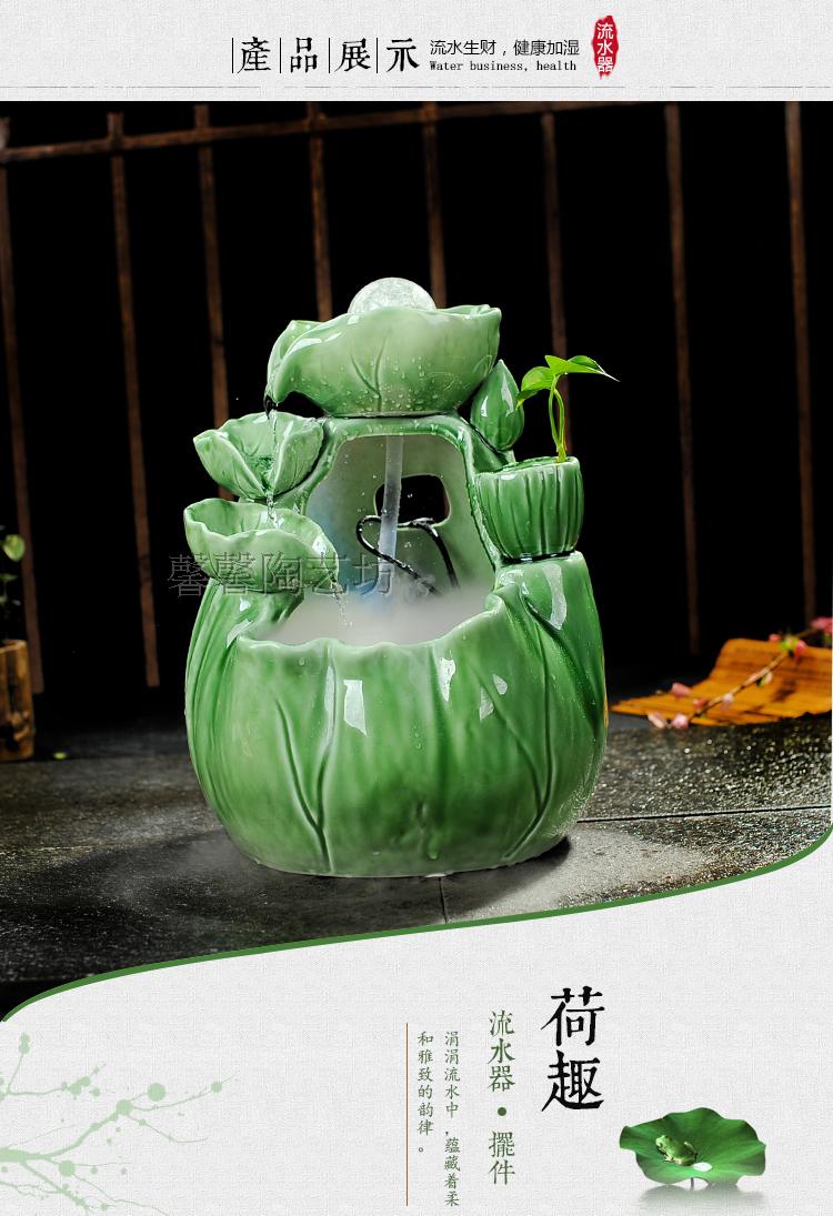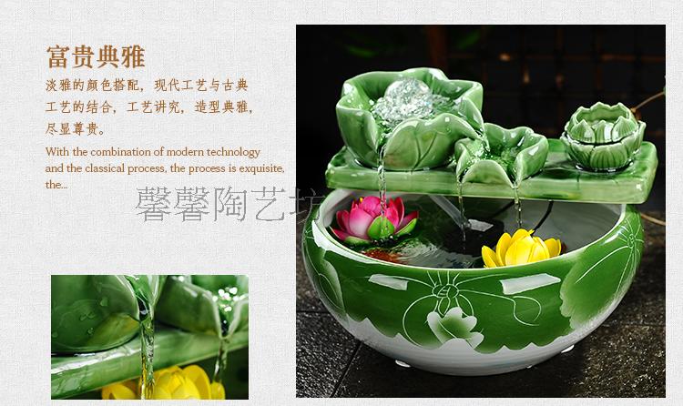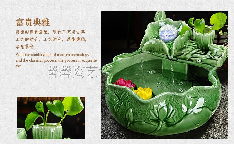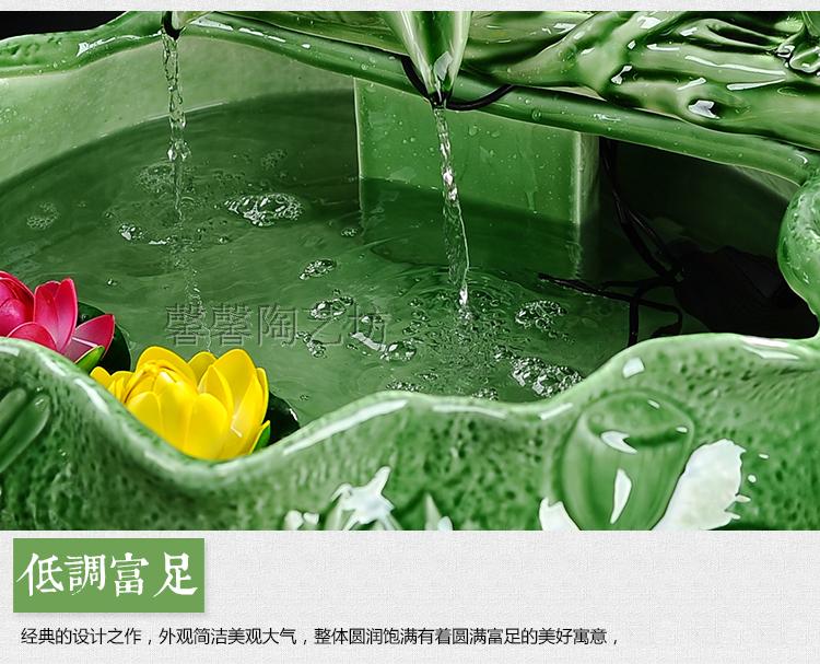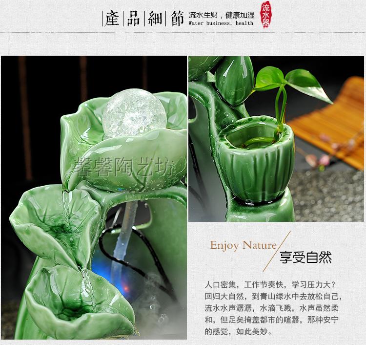 | 本公司大部分商品6一10天到貨。不接急單。急單的客戶請不要下單。感謝諒解與合作! 還免費贈送適量天然鵝卵石,如有需要請與客服聯系。 【名稱】清香流水器 【材質】陶瓷 【套裝】一個水泵 ,贈送兩朵荷花,不包含霧化器,如需霧化器需另拍, 【產地】瓷都—德化 【包裝】普通包裝 奇特的噴水變幻過程中,產生的大量負氧離子,粉塵結合,將其吸附于水中沉淀,能有效驅除二手煙、甲醛、一氧化碳,水中滴入植物,將會室生香,有養神、美顏保健的功效。濕潤的空氣能使人保持生機盎然,避免皮膚干燥、眼睛干澀。能舒緩神經緊張,消除疲勞,保持容光煥發。同時也起到很高的觀賞裝飾作用和實用價值。特別是空調房間和干燥氣候尤其適用!獨特的產品,回歸大自然的境象,讓人有一種處于世外桃源的感覺,還有一股潺潺流水聲,更為你的家居擺設增添了一份生機。陶瓷噴泉是少有的能把觀賞性和實用性相結合的陶瓷工藝品,是單位開業、親友喬遷、新居落成之饋贈佳品。同時適用于辦公室、大廳等公共場所的空氣凈化作用。 使用范圍:開業慶典,展廳擺件店面裝飾花園擺件房地產別墅擺件酒店大堂客廳裝飾品園林假山池塘擺件
