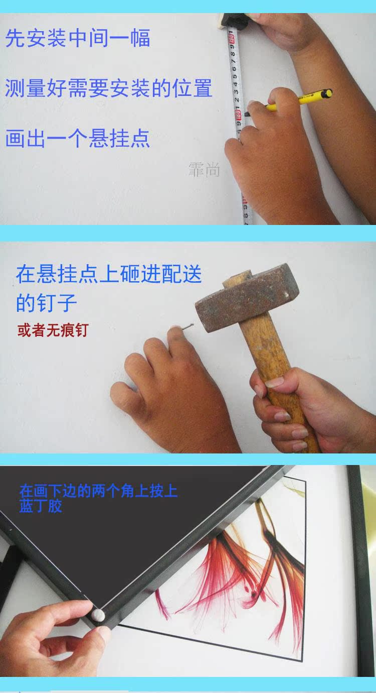 默認鋼釘,如果親需要無痕釘安裝,請拍單時在備注里注明或者和客服說一下。這是無痕釘: 代替鋼釘的時候將小尾巴朝上。無痕釘安裝非常方便,不傷墻,幾分鐘就搞定三幅畫的安裝,因為它的鋼針很細,很容易釘進打膩子的墻。但是它只適用打膩子的墻!如果親家里是瓷磚墻,只有選擇鋼釘了!這里要說明的是:不同花型的畫、不同尺寸的畫,其背板上的掛鉤不一定相同,所配的無痕釘形狀不一定和上圖完全相同,請親不要介意,我們保證其無痕釘和背板上的掛鉤是絕對配套的,這一點請放心!