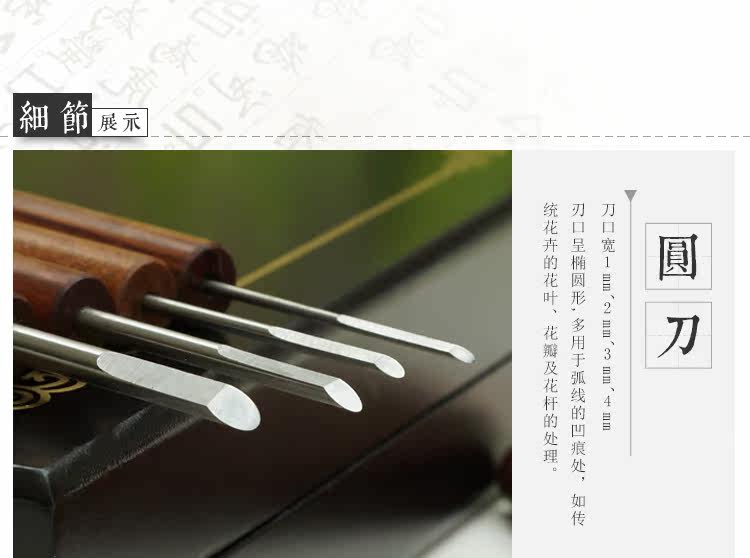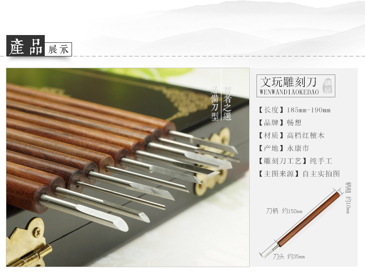 | 本公司大部分商品6一10天到貨。不接急單。急單的客戶請不要下單。感謝諒解與合作! 文玩雕刻刀 10把刀包括: 1、平刀3把1.4~3mm 2、圓刀4把1~4mm 3、左斜刀1把2mm 4、右斜刀1把2mm 5、三角刀1把2.5mm 刀柄采用紅檀木,漂亮、高檔、柄的表面用砂紙拋光打磨,握在手中更加舒適,更加美觀實用! 刀頭采用60-63度白鋼精制而成,硬度適中,光亮細膩,鋒利好用。刀頭的邊角已經經過手工打磨,不易傷手,非一般劣質產品可比。刀口經過精心開刃,十分鋒利,到手即可馬上使用! 現在購買:買一套雕刻刀,送正宗德國勇士砂紙小片5000目3張、7000目3張、油石條1根油石條是易碎品,路上破損不補寄的,破損了也能用,照樣打磨哦。【用途】:用于金剛、核桃、杏核、緬茄雕、菩提根子、橄欖、果等文玩及木材、橡皮印章等雕刻。 ![]() ![]() ![]() ![]() ![]() ![]() ![]() ![]() ![]() ![]() ![]() ![]() ![]() ![]() ![]() ![]() ![]() ![]() |