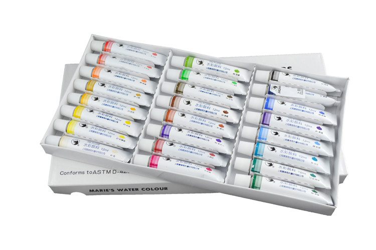 規格:12ml/支 24色/套色系:白、檸檬黃、淡黃、藤黃、土黃、桔黃 朱紅、大紅、玫瑰、深紅、紫羅蘭、赭石熟褐、生褐、淺綠、草綠、深綠、?青綠 湖藍、鈷藍、群青、普蘭、青蓮、煤黑