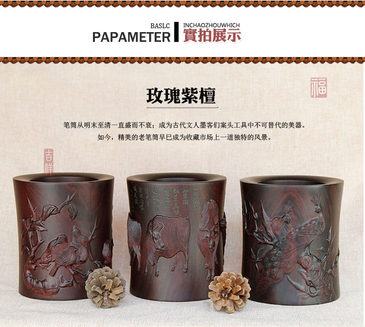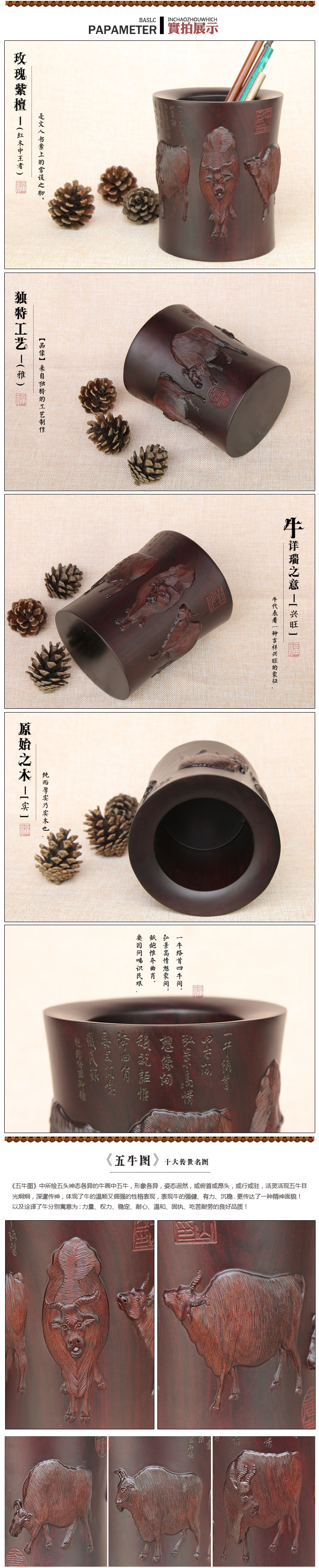 《五牛圖》-高級牛毛款玫瑰紫檀木文房四寶筆具紅木筆筒擺件實木辦公筆筒木雕毛筆筒禮品