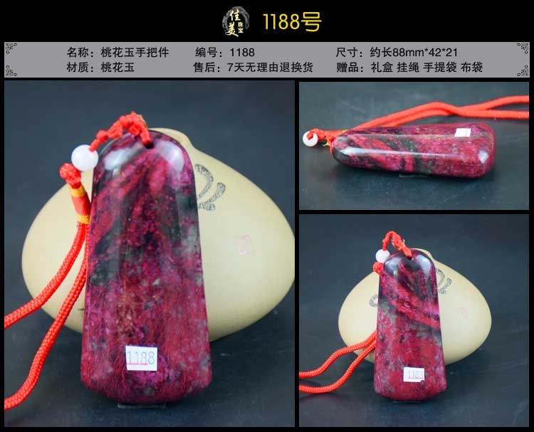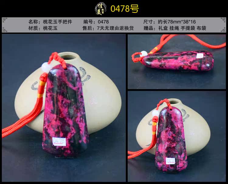 百年保真 拒絕贗品 傳世品牌 桃花玉,也稱桃花石。學名:薔薇輝石,是一種石英巖,國內產地很多,產于昌平,省祁連山一帶。該石質地、硬度極似翡翠,又稱粉色的翠。石質微透明,富有玻璃光澤。石中含多種金屬礦物成分,同一石上呈現互不滲透的不同顏色或互相滲透的混合顏色,經加工拋光,呈鮮艷的桃紅色并間雜黑色的紋飾。桃花玉為原礦狀分布,開采后其切開面呈黑色、綠色、淡藍色等線條有機組合,紋理清晰,畫面組合協調,色美質麗,可與彩玉石媲美,頗具觀賞價值。桃花玉的石質紅膩,色彩斑斕,晶瑩剔透,有的紅似桃花,有的綠如荷葉,有的亦若燈花,五彩繽紛,絢麗多彩。桃源石分為桃花玉和桃源寶石。
