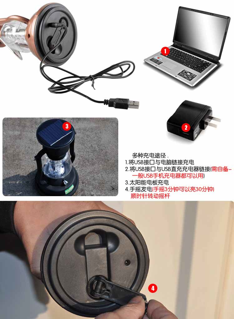 品名:太陽能和手搖發電充電野營燈 重量:330g 電池:內置3節鎳氫電池 燈泡:16顆高亮度LED流明燈泡 發電方式: 有四種充電方式:太陽能充電/手搖發電/USB線連接電腦充電/USB線連接充電器接220V電源直充/需自備USB充電器連接 包裝:彩盒包裝 用途:用于出外旅游,野營,晚上夜行等照明用途。