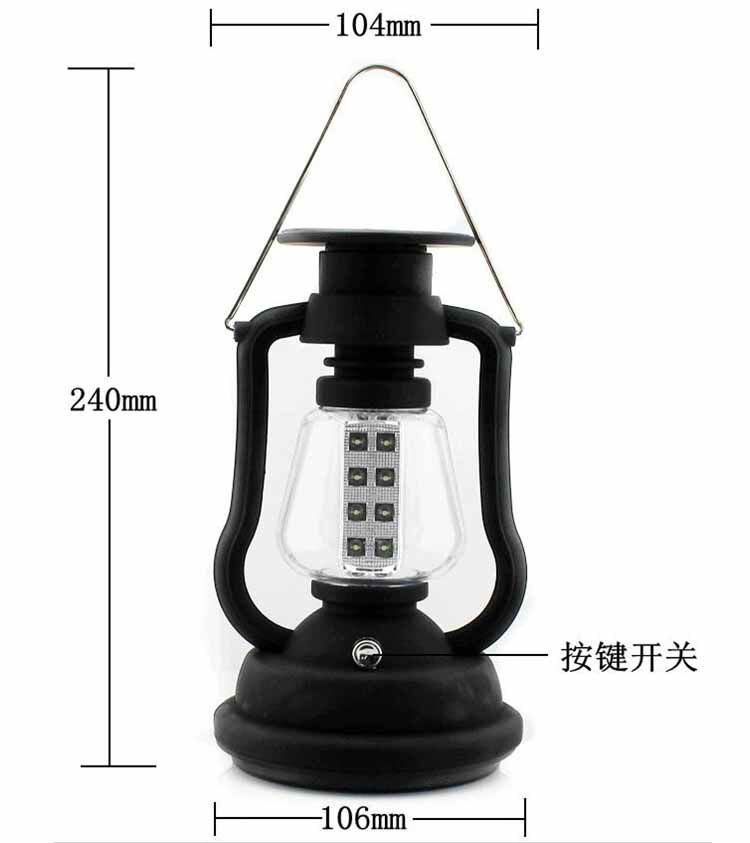 本款野營燈采用太陽能電板和尾部手搖發電設計,是一款節能性的野營燈,內置3節可充電池,白天可以用太陽能充電,晚上沒電的時候可以通過手搖發電對電池進行充電。親們不用擔心電池不夠用了,少電池的使用,為環保做出一份貢獻。外觀古樸而大氣美觀,是出游旅行野營必不可少的照明用具。 : |