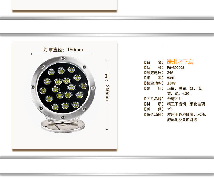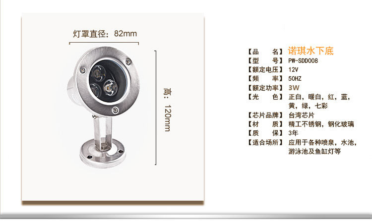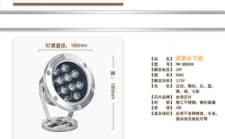 溫馨提示:國家規定水底燈必須使用AC輸入電壓,切勿直接接220V電壓,一接會燒壞的喔,須配變壓器使用,建議變壓器的瓦數是燈具的總瓦數的2倍以上,這樣子才能保證燈具的壽命喔例如:您購買了1個12w的水底燈,您需要買24w以上的變壓器,本店有變壓器出售。
