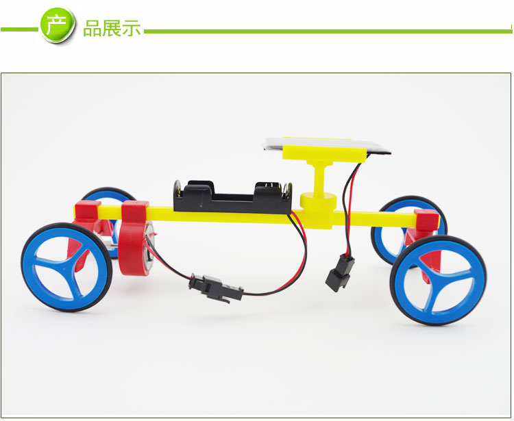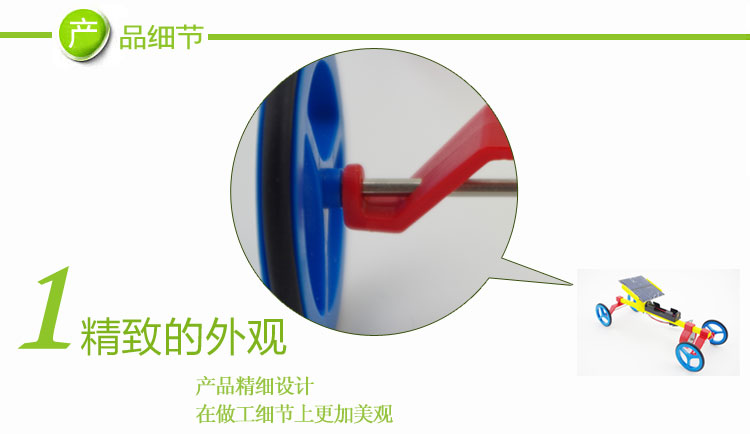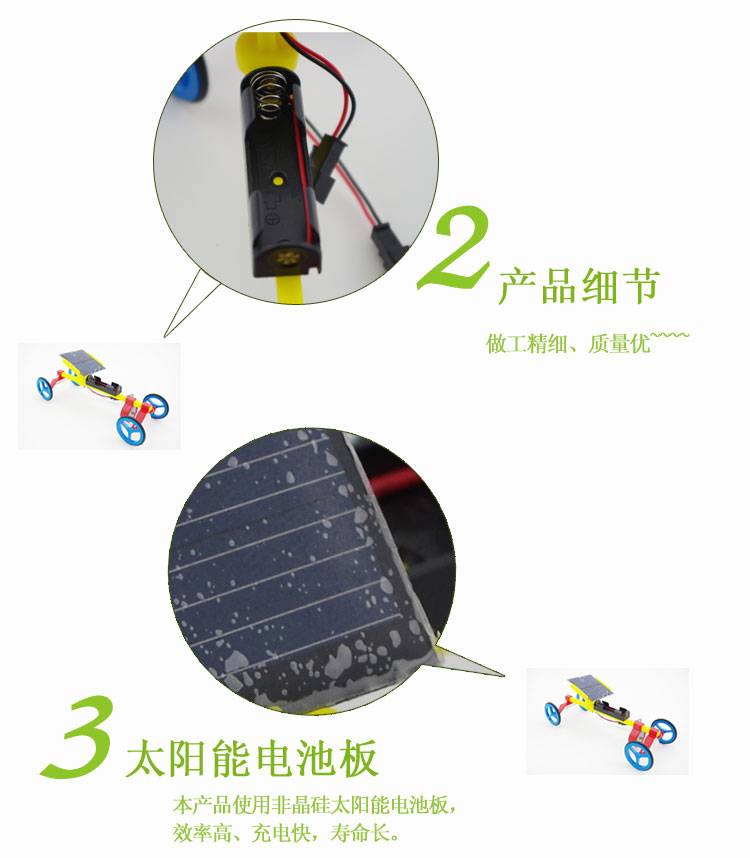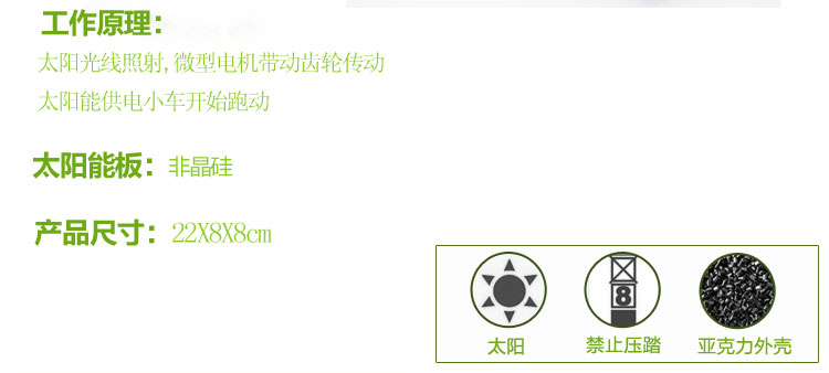 【產品名稱】太陽能加長版賽車模型/太陽能玩具車/太陽能小車/太陽能DIY小車【工作類型】太陽能供電如需室內玩耍另購5號電池【可選顏色】花色【太陽能板】1W【重 量】110g【產品尺寸】22X8X8cm【包裝尺寸】20X12X3cm【注意事項】本產品模型有較小的部件,誤吞服可能會導致窒息危險,絕對禁止3歲以下兒童使用。不得在道路及人員密集區域使用,以免發生事故。組裝完成后請注意保管組裝操作說明書,以便于下次使用。【運行環境】室外:陽光下太陽能賽車會跑的飛快。室內:需另購電池裝在干電池倉【工作原理】微型電機,齒輪傳動,太陽能供電【功能特點】最快速度可達3米/秒,爬坡能力可達30度,易組裝易調節。太陽能賽車采用太陽能環保能源,具有教育意義和相當的示范效應,可以培養孩子們良好環保概念,是太陽能知識普及和應用推廣的好工具,是啟發兒童科學探究精神的好教具,也是時尚你桌面的好玩具。具有觀賞和收藏價值。保護有限的能源,提供環保能源的利用。