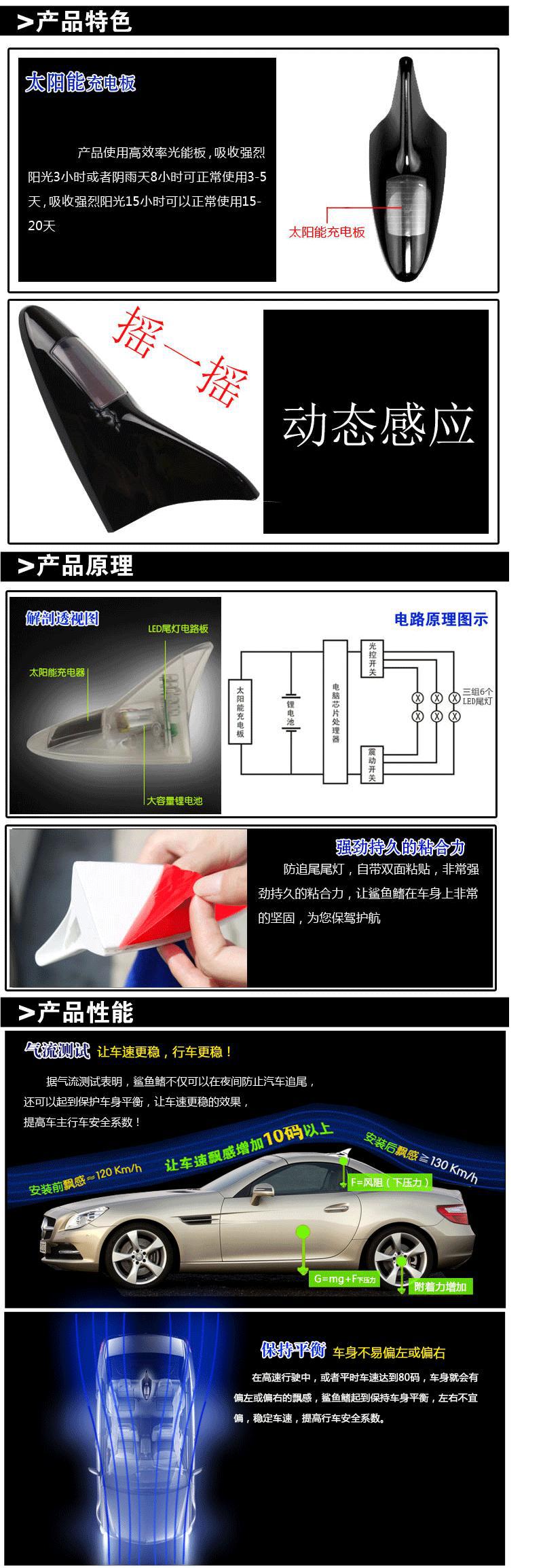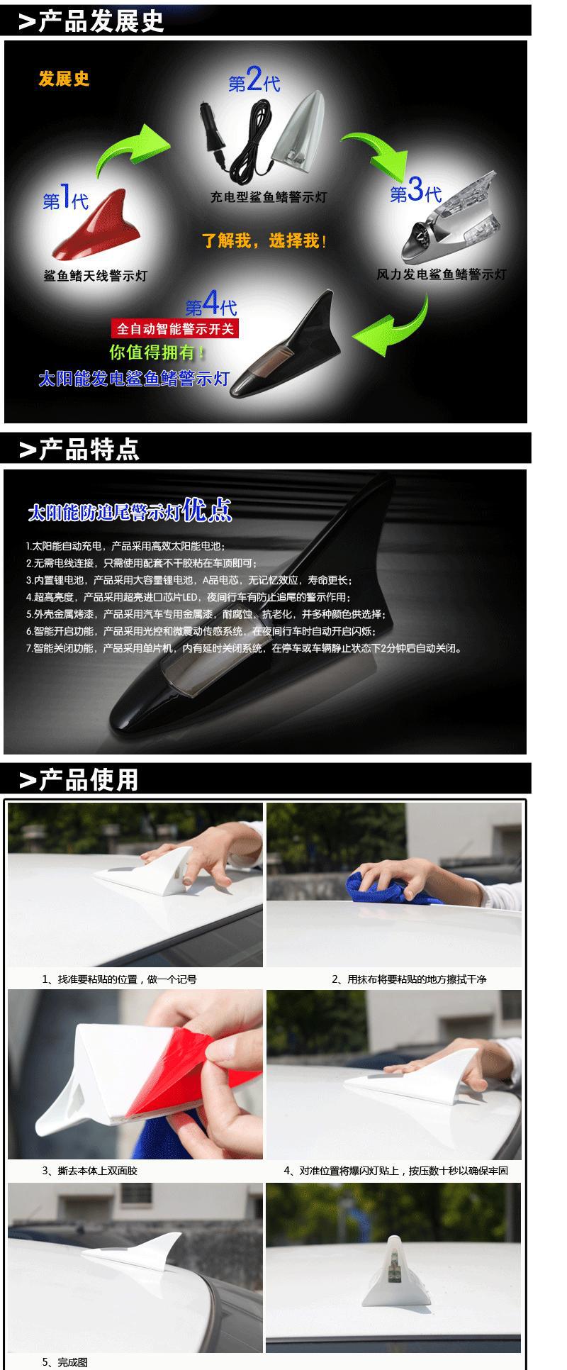 | 本公司大部分商品6一10天到貨。不接急單。急單的客戶請不要下單。感謝諒解與合作! 太陽能充電,內置鋰電池,免接線路,光線暗并有震動時行駛中顛簸自動閃爍藍極光,光線亮或者光線暗但無震動120秒后自動停閃,高智能! ●有的車主擔心閃爍時的燈光太亮,其實只要亮度不大于尾燈就是合格的,本店已售出5000只以上,沒有過問題,請放心使用! ●和一些便宜的風力燈相對,此款的材料、做工要好很多,表面更是高質量的烤漆,鋰電池壽命也更長,所以成本也高,請勿拿低價低質的風力燈來比價! 【產品特點】 1.太陽能充電,產品使用高效率光能板,吸收強烈陽光3小時或陰雨天氣8小時可正常使用3-5天,吸收強烈陽光15小時可以正常使用15-20天。 2.內置鋰電池,產品采用A品大容量鋰電池,經久耐用。 3.無線連接,不需要對原車改動,撕開雙面膠貼上即可。 4.高亮度,燈光亮度接近尾燈,LED燈是由定做的15*15方片燈芯,穩定性好,行車時有很好的警示作用。 5.外殼烤漆非噴漆,原車同色烤漆,基本上專車專用,產品表面有很高的光潔度,和原車車漆一樣耐腐蝕,耐老化。 6.行車警示功能自動開啟,內置高敏度震動傳感器及感光系統,在行車同時光線較暗的還進下自動閃爍。 7.智能關閉系統,線路采用14腳單片機,雙回路控制,內有延時關閉系統,在停車及燈紅燈過程中繼續閃爍,停車或車身勿震動120秒后自動關閉。 8.外形時尚美觀,流暢的鯊魚鰭設計。. 【產品功能】 【產品特點】 本公司是太陽能天線爆閃燈的廠家,需要大量訂購或定制的客戶請直接聯系本人,或者聯系, 產品均為實圖拍攝,確保發過去的產品跟圖片相差無幾