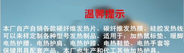 自產自銷各款碳纖維發熱片 碳纖維發熱膜 硅膠發 鋁箔發熱片 來樣定制各種型號發熱制品。適用于:加熱鼠標墊 暖腳墊 電熱護腰 電熱護肩 電熱護膝 電熱鞋墊 電熱手套等保健用具配套產品。也生產和加工其他加熱護具。歡迎垂詢!!! 定做加工請聯系或加微信咨詢