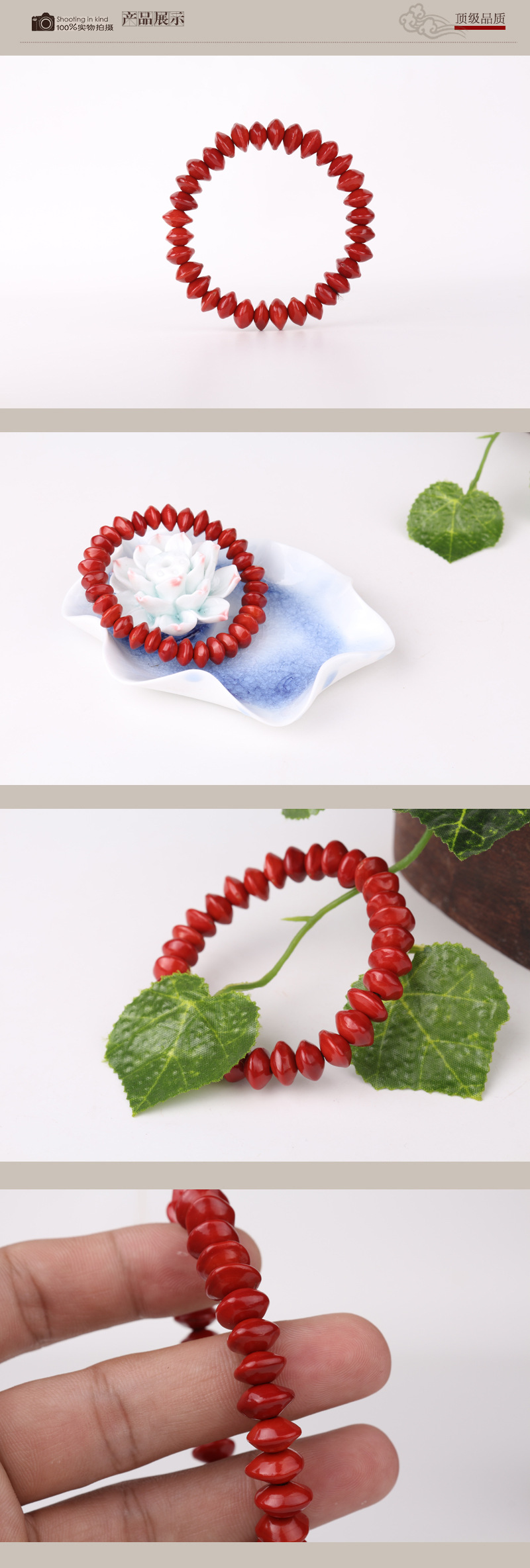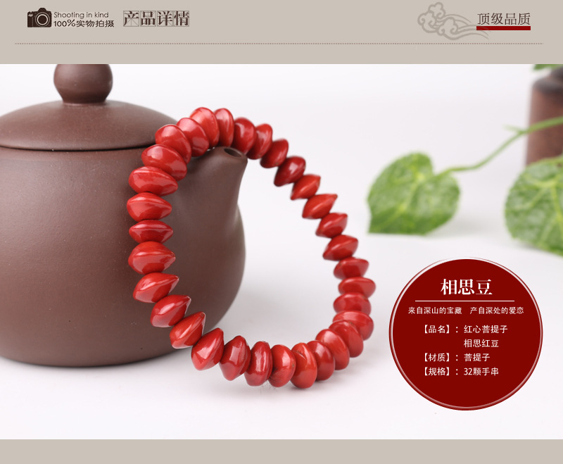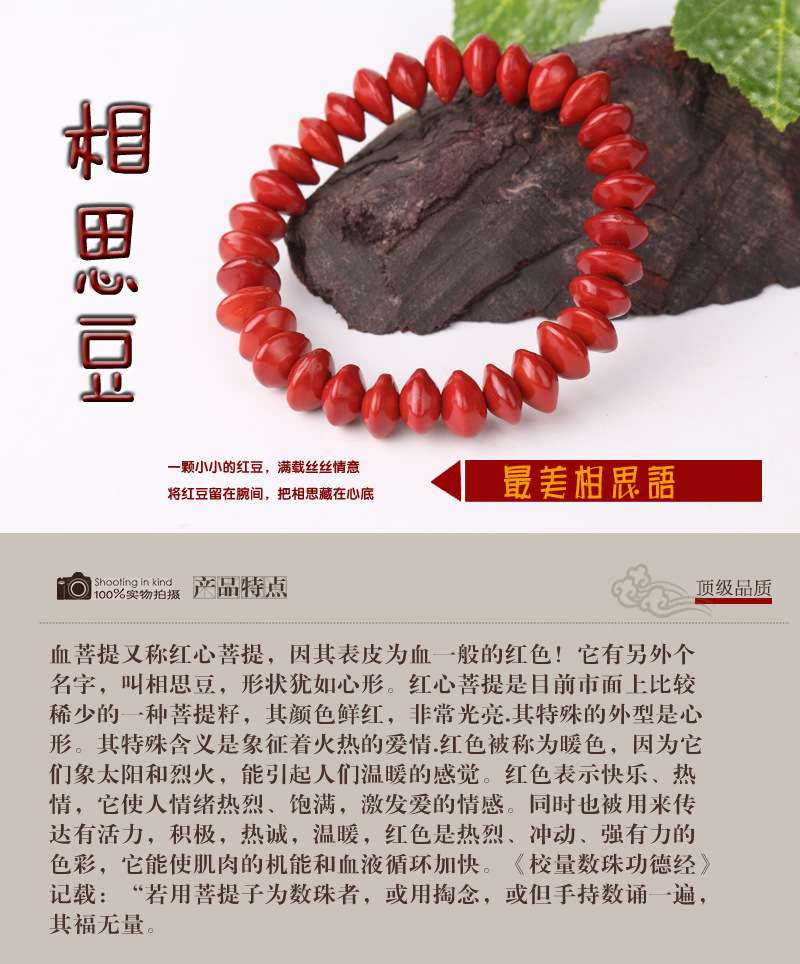象征著火熱的愛情。紅色表示快樂、熱情,它使人情緒熱烈、飽,激發愛的情感。 同時也能調理肌肉的機能和血液循環。 相思紅豆,又名海紅豆,血菩提,屬于菩提子的一種。單顆直徑約8mm左右,手串重量約5克。因為種子的大小而有小實孔雀豆和大實孔雀豆之分。樹高三四十米,吸取天地之靈氣精結而成。相思紅豆質堅如鐵、質堅如鉆、色艷如血、形似跳動的心臟,紅而發亮,不蛀不腐,色澤晶瑩而永不褪色。其外形及紋路,皆為“心”字形,真是大心套小心,心心相印。 掌柜提醒:相思紅豆為天然植物種子,種子本身有著堅硬的外皮,不蛀不腐,但是要加工成首飾就必須鉆孔,因此請您不要戴著它洗澡游泳和或長時間泡在水中,以免種吸收太多水分脹壞美麗的外皮。