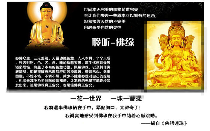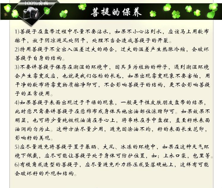千眼菩提是一種珍貴的菩提,其表皮經過打磨后會形成一個個黑色不規則的斑點。遠看有如一個個眼睛,所以叫它千眼菩提。純天然千眼菩提打磨后顏色偏黃,偶爾有綠皮,芽孔,均不屬于質量問題。芽孔可以由玩家自己拿寶石填補,綠皮則會在盤玩的過程中慢慢消失。因其密度較低,所以佩戴的時候請注意盡量避免碰水。