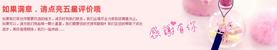 每一次購物過程都是一個美好的開始。親,如果您收到我們的商品感到意,請在我們的留言區寫上您的心得甚至秀一下您的佩戴效果,將這份美好分享給其他和你一樣喜歡我們商品的買家朋友。 如果您不意請告訴我們 不論什么原因讓您不意的,我們表示萬分的遺憾和歉意。但是請您千萬不要著急,也不要急著對我們進行評價,請第一時間聯系我們的客服以或客服。我們會妥善為您處理,請您在我們處理后給予我們客觀的評價。 |