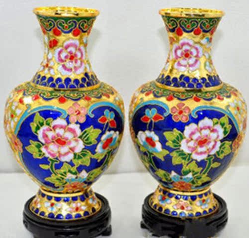 10吋一對帶底座景泰藍花瓶工藝品銅胎掐絲琺瑯 金地花絲牡丹 高檔擺設