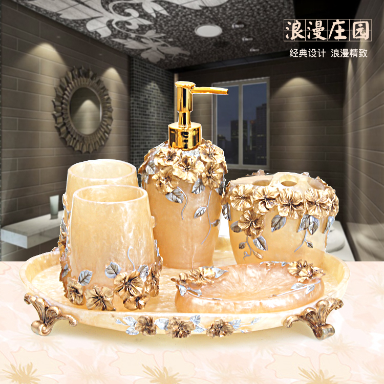 三色堇仿古+仿古托盤高檔樹脂衛浴五件套洗漱套裝衛生間家居用品擺件洗浴新婚禮物
