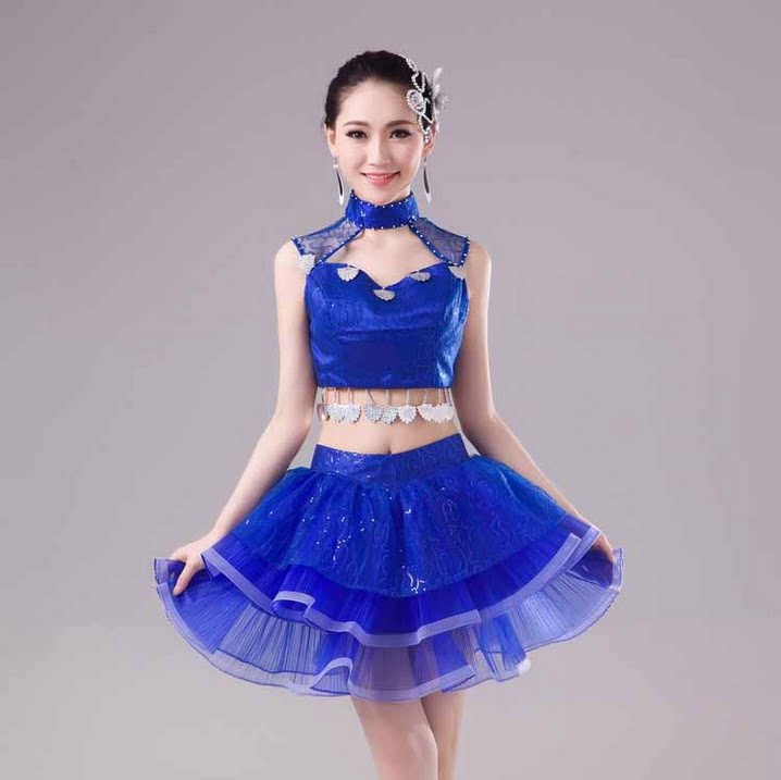 藍色XXXL新款現代舞演出服亮片裙廣場舞表演服熱舞勁舞小短裙女裝開場舞