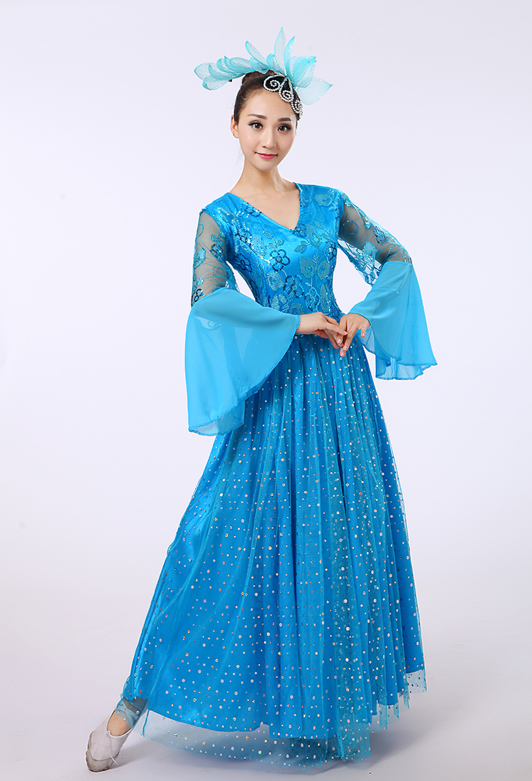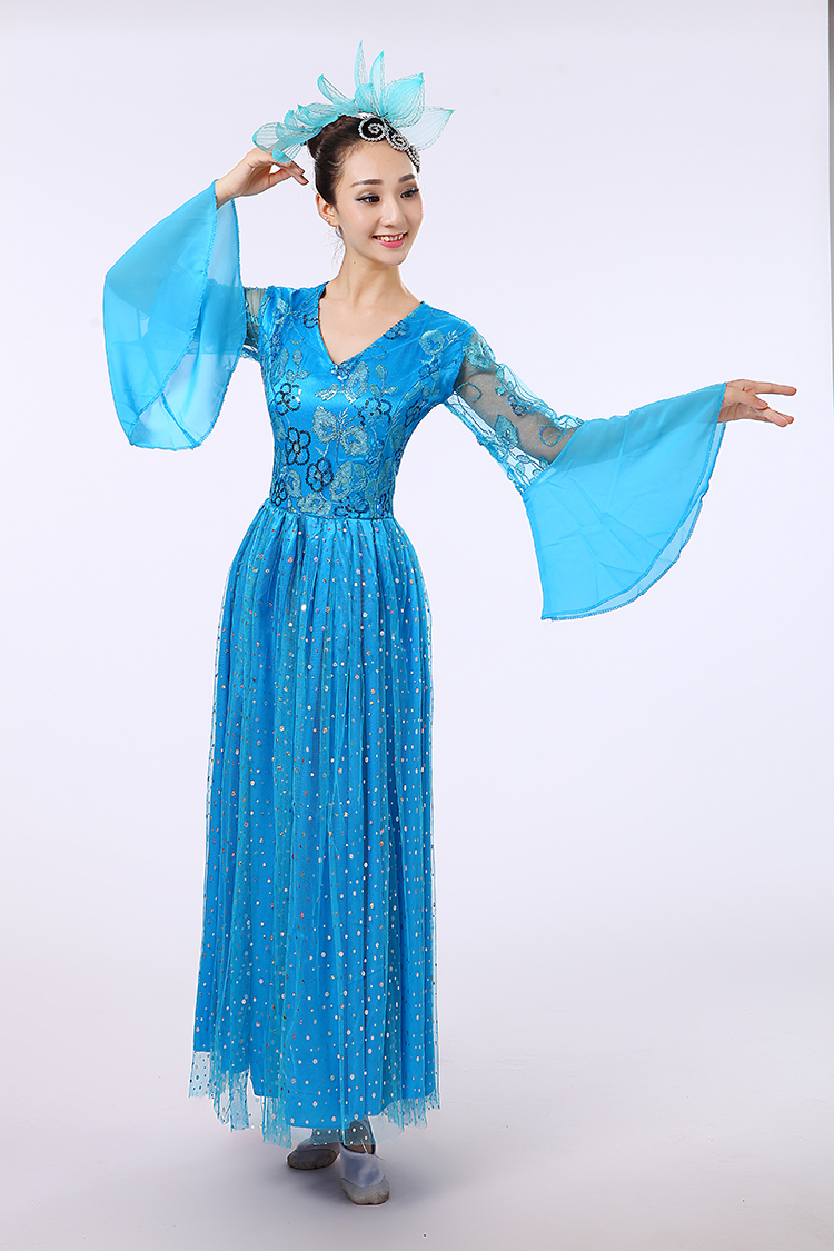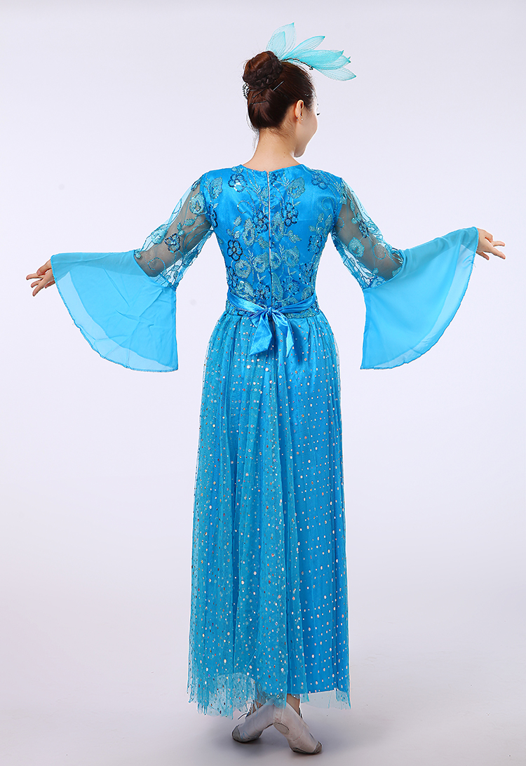 藍色M新款舞蹈大擺裙古典舞蹈服裝舞臺服裝扇子舞蹈演出服腰鼓服民族服