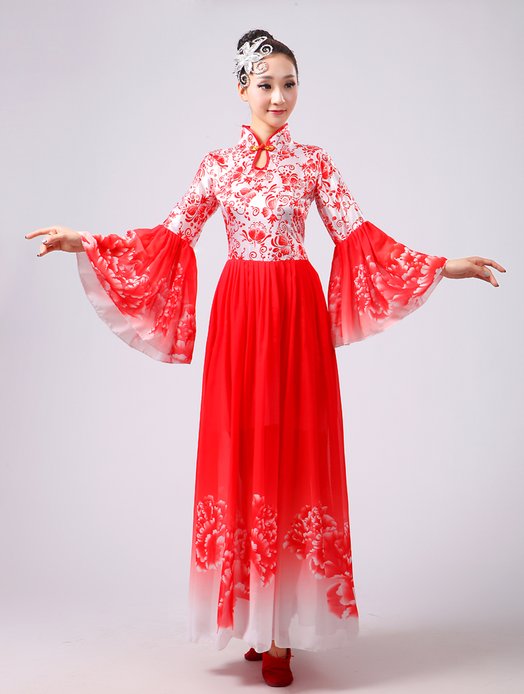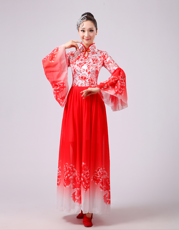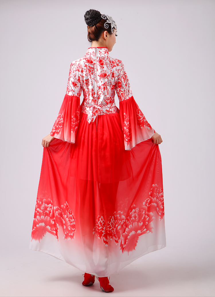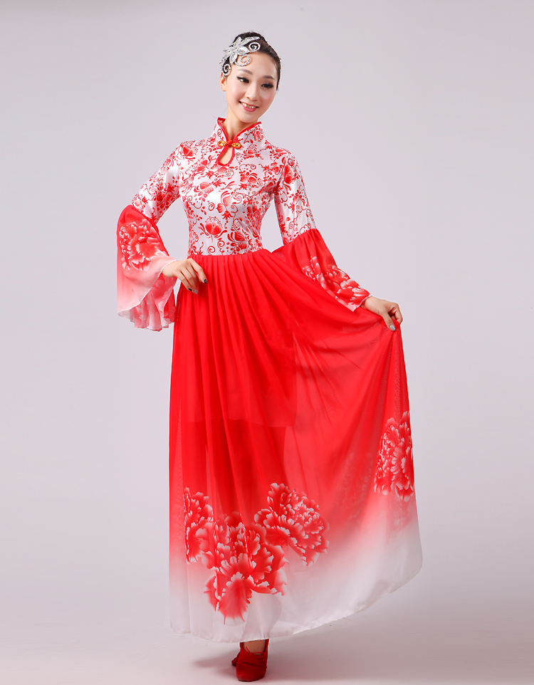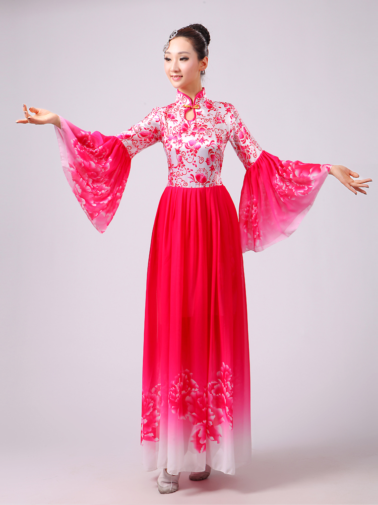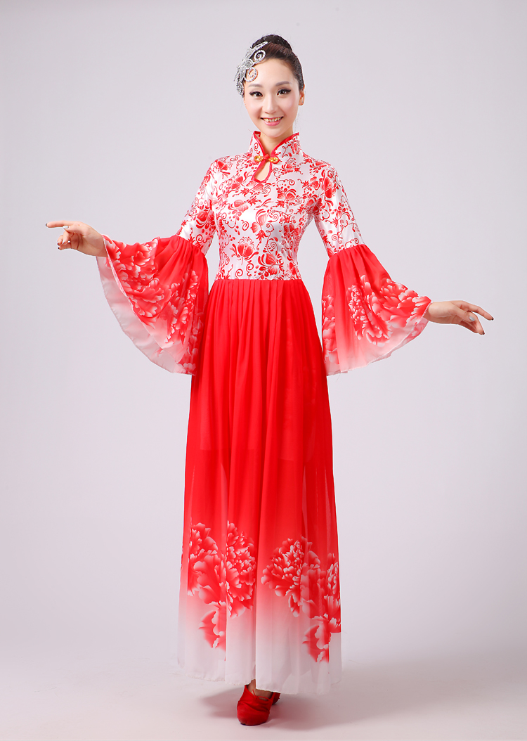 玫紅色S胸圍2.62016新款合唱服演出服夏季女民族開場舞大合唱大擺裙廣場舞青花瓷