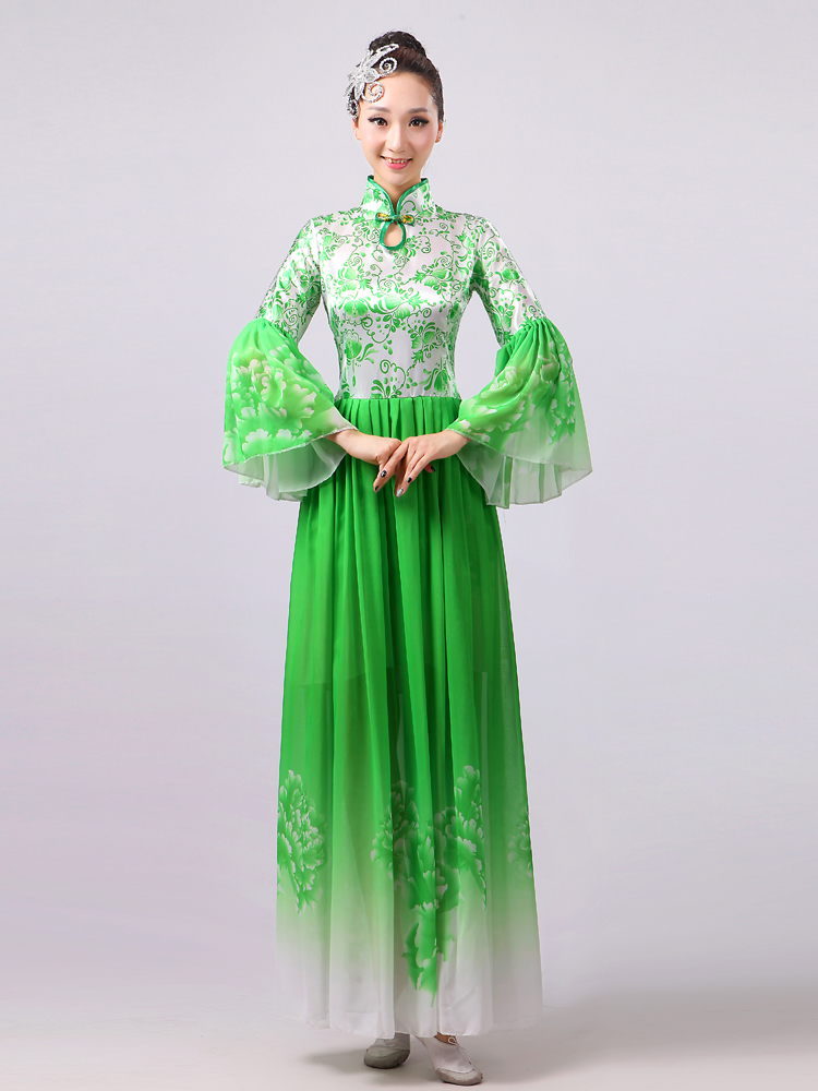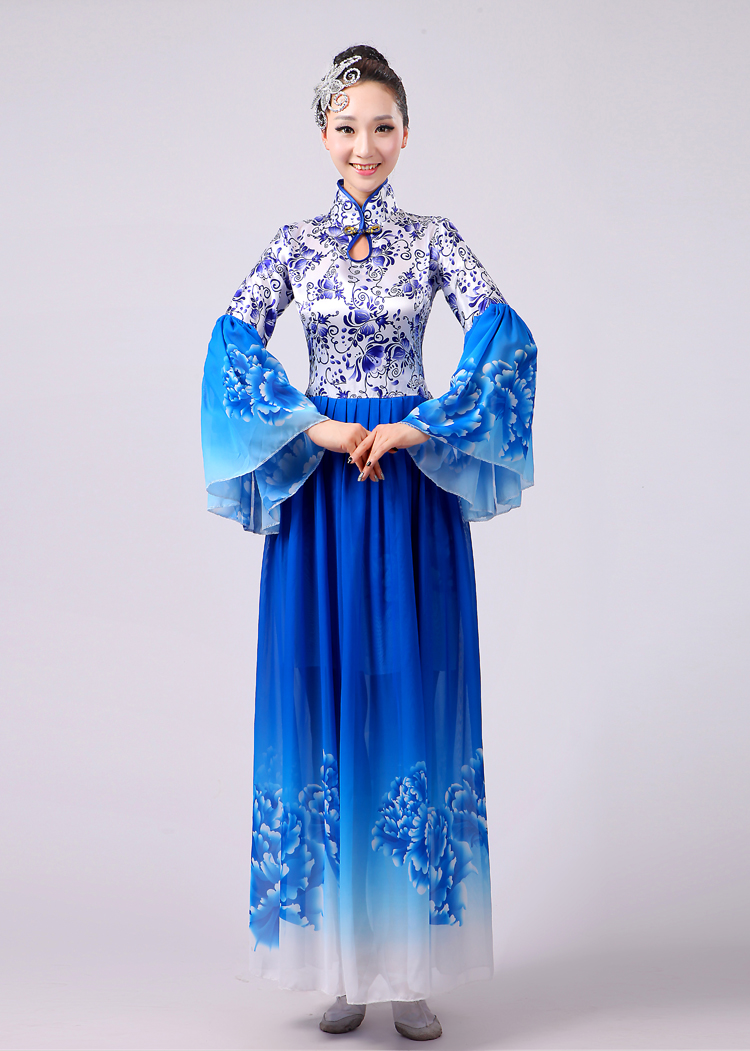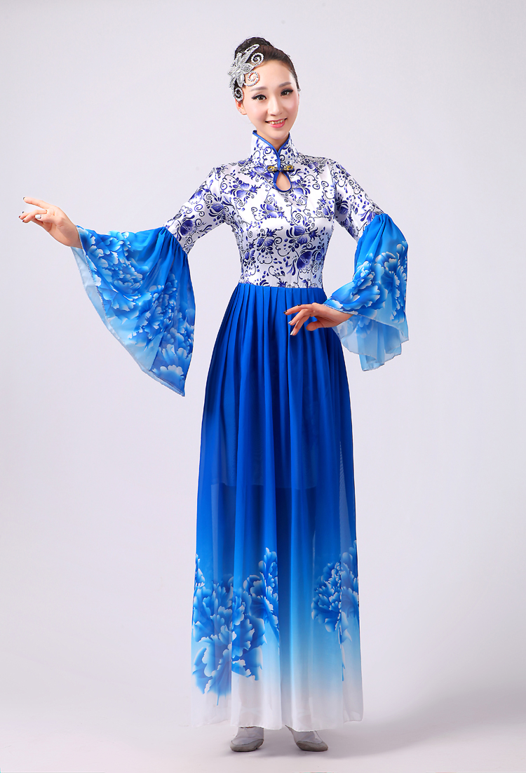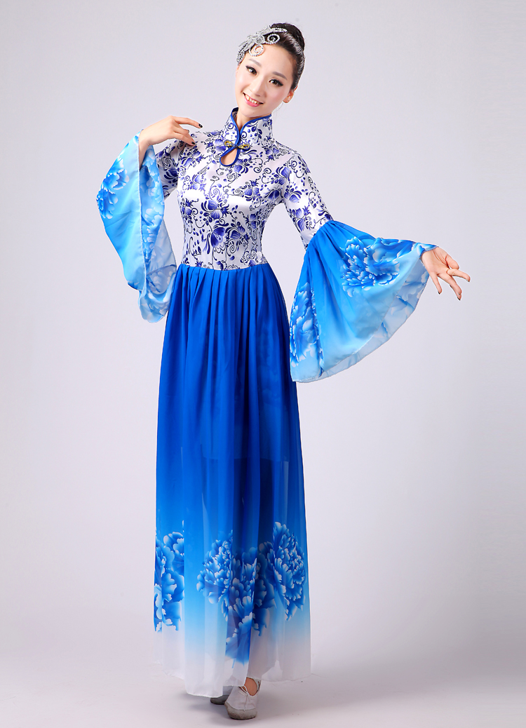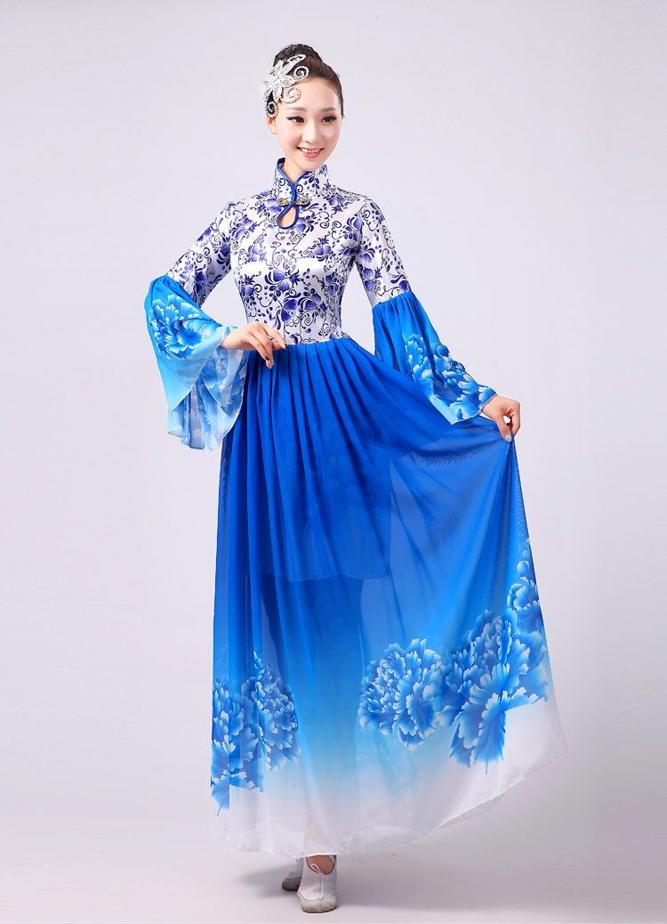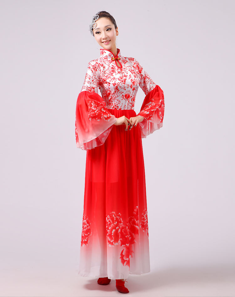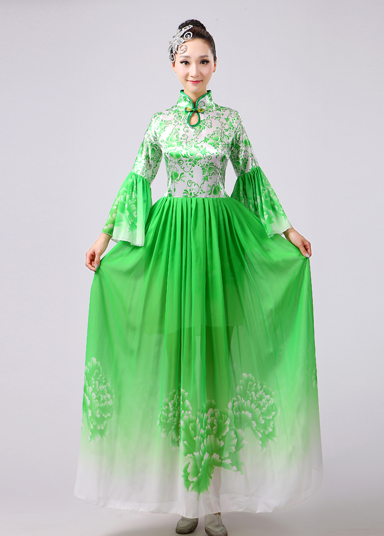 玫紅色S胸圍2.62016新款合唱服演出服夏季女民族開場舞大合唱大擺裙廣場舞青花瓷