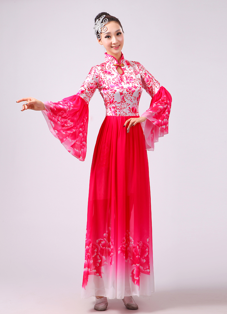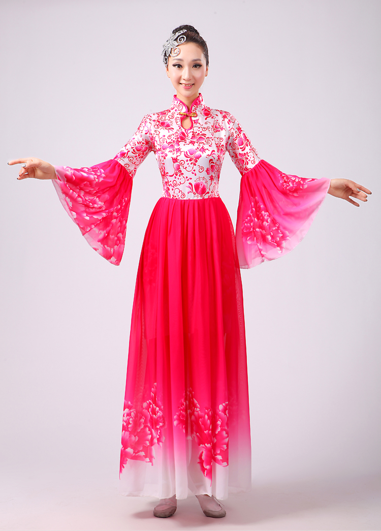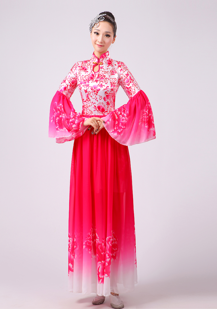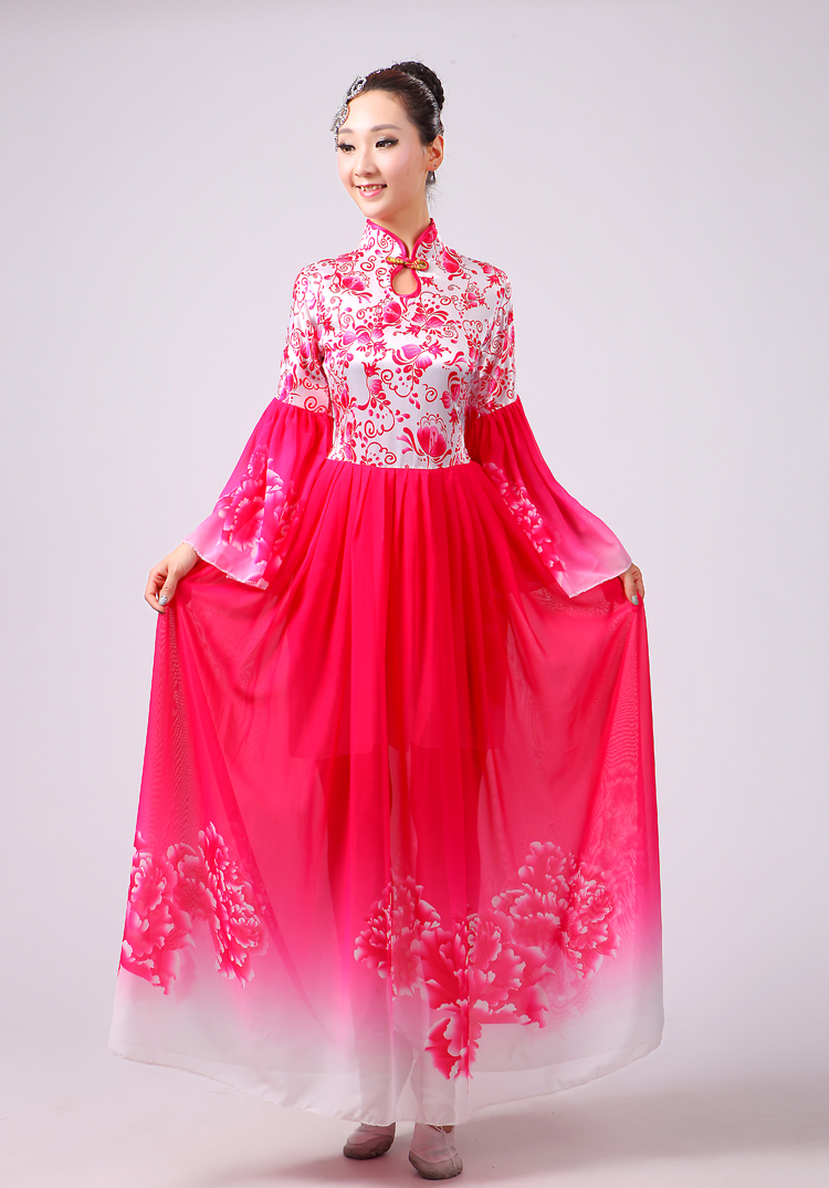玫紅色S胸圍2.6新款合唱服演出服夏季女民族開場舞大合唱大擺裙廣場舞青花瓷