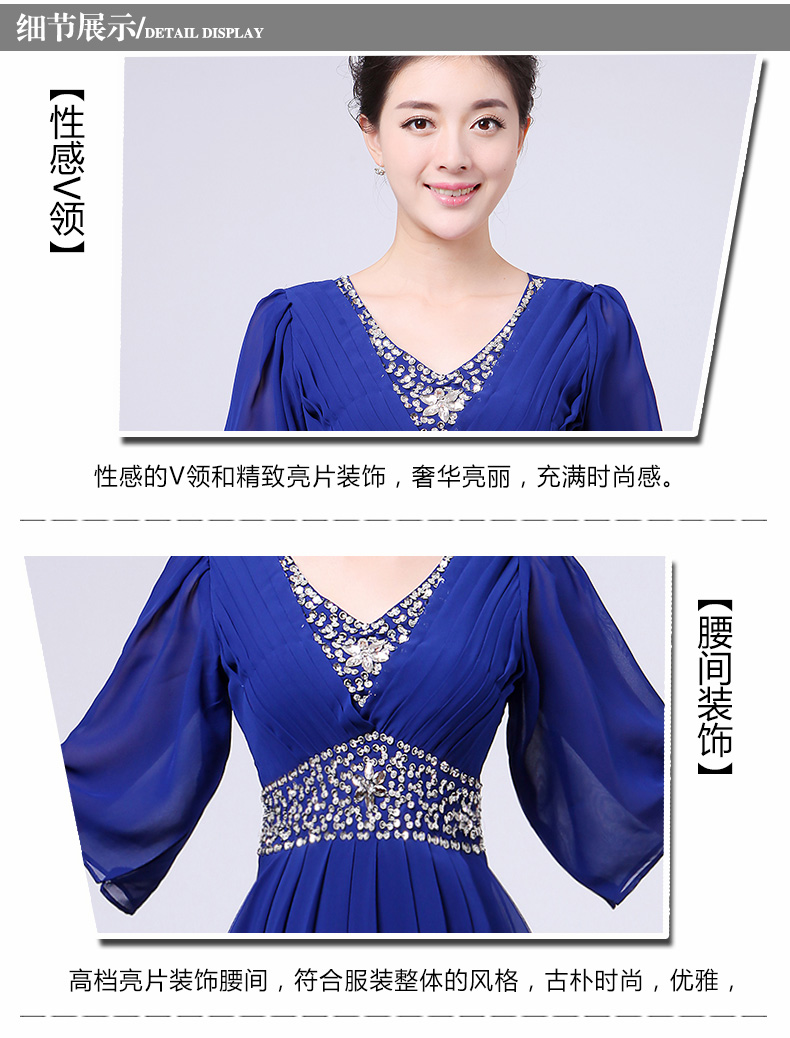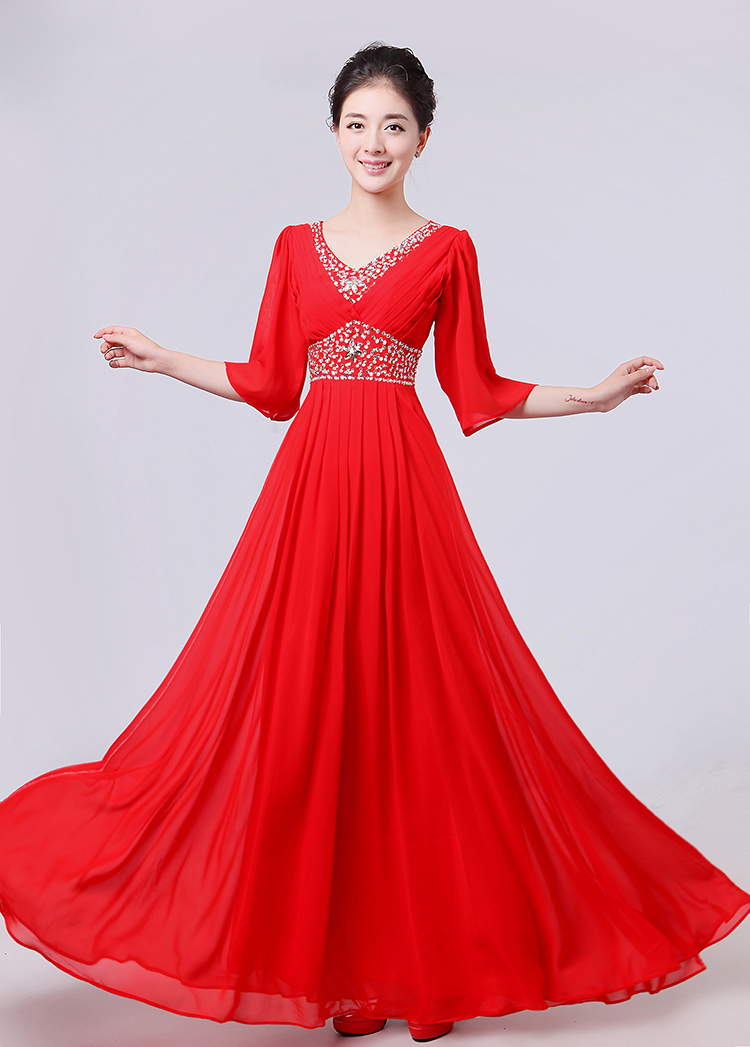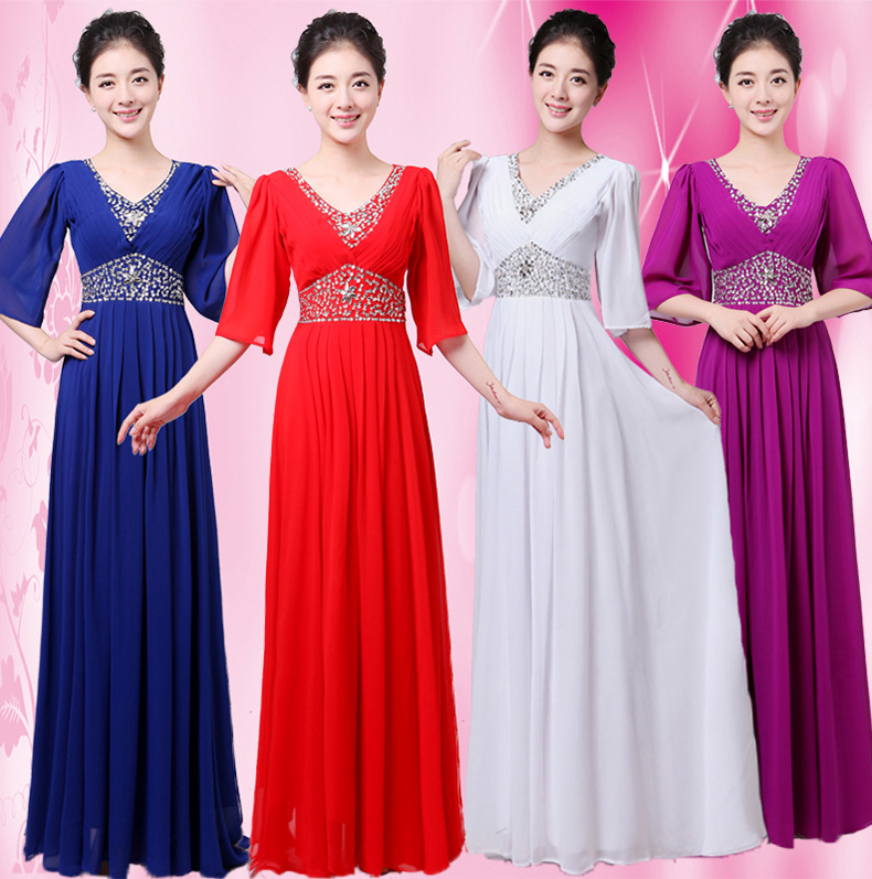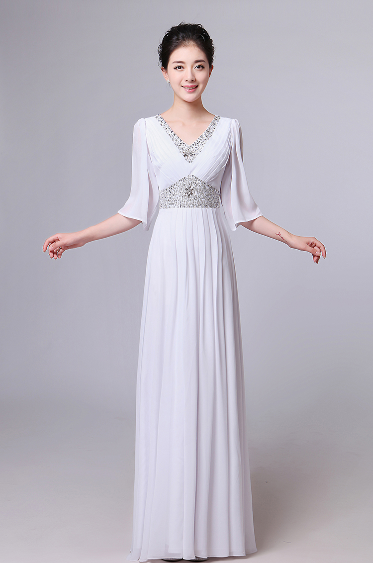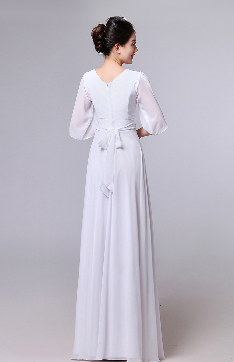 白色S新款女合唱服長裙宴會主持禮服開場舞大擺裙V領長袖大合唱演出服