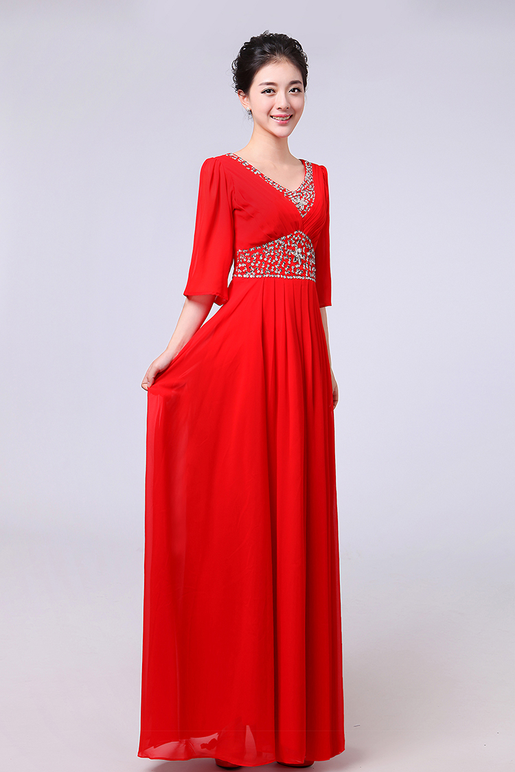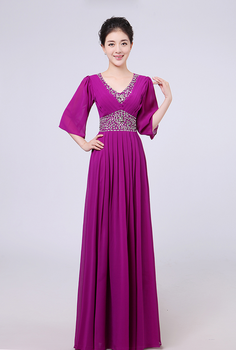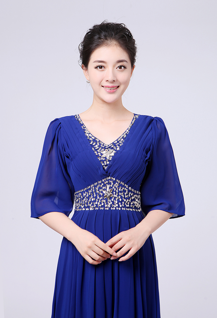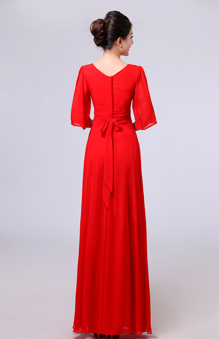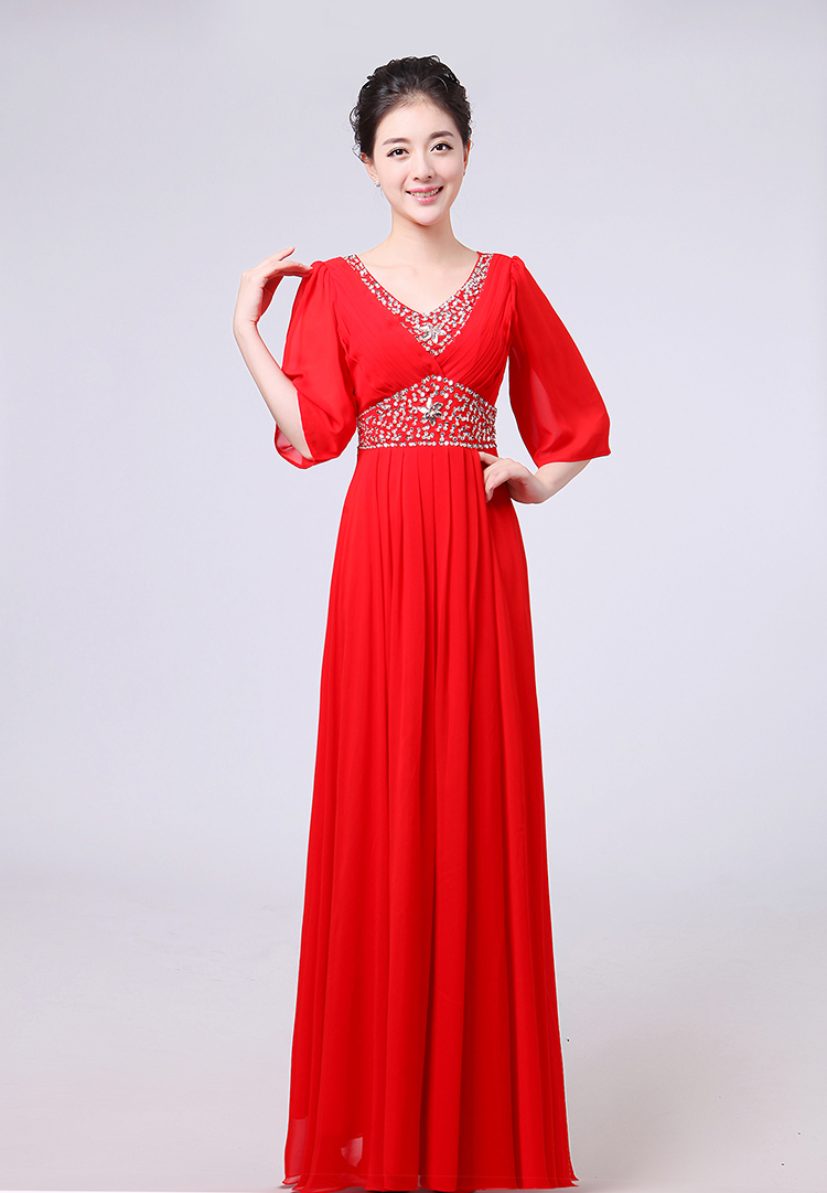 白色S新款女合唱服長裙宴會主持禮服開場舞大擺裙V領長袖大合唱演出服