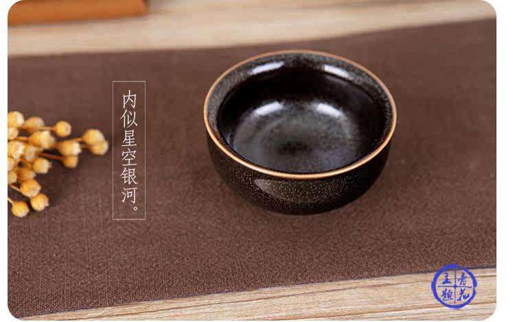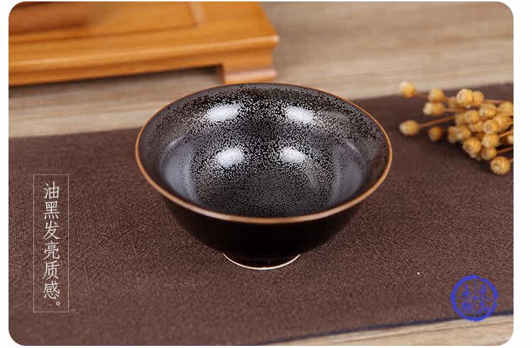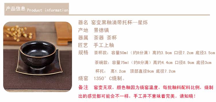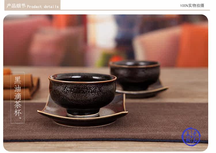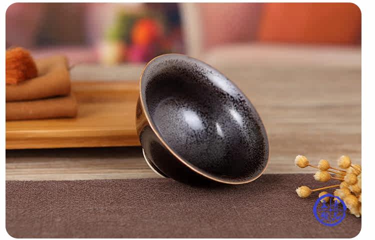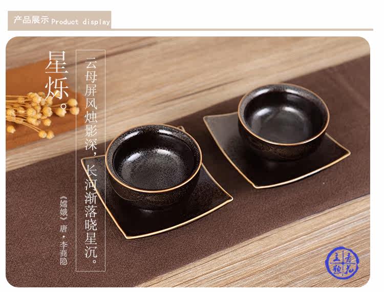 飲下那九天銀河。 飲茶: 杯子帶托,純手工。有一種深沉的高貴。 釉色和景德白瓷比起來厚實一些,屬于大杯了。所以單杯是可以做主人杯的。對飲也好。 我們自己用過這個杯子,喝的是本地綠茶,聽水燒開,泡茶聞香,飲茶卻是是要顯得安靜而又肅穆一些。 入茶湯之后卻是有一絲美輪美奐的深邃。 拿起茶杯,聞香飲茶,正如飲下那九天的銀河。 ------------------------ 匠藝: 黑釉的器物是比較少見的,一旦見到卻莫名喜歡,成熟而又穩重的神秘黑, 黑釉中有銀光閃閃,確實少見。杯子內泛這銀光真是如同夜里的銀河一般。 黑釉,自唐開始,鼎盛于宋,分別有純黑釉以及花色黑釉兩種,比較著名的建盞,兔毫,滴油等都是大家喜愛之物。 而此款杯子釉色正是油滴,油滴是在釉上布具有銀灰色金屬光澤的細小圓斑點,狀如油滴,因而得名。 這一套為油滴茶杯黑中泛點點銀光,宛若當空掛繁星,黑釉容易沉悶烏黑,而這一套的油滴卻擁有金屬發亮的質感。 很厚重,黝亮誘惑的黑色茶杯,兩種款式可以選擇,希望大家喜歡。