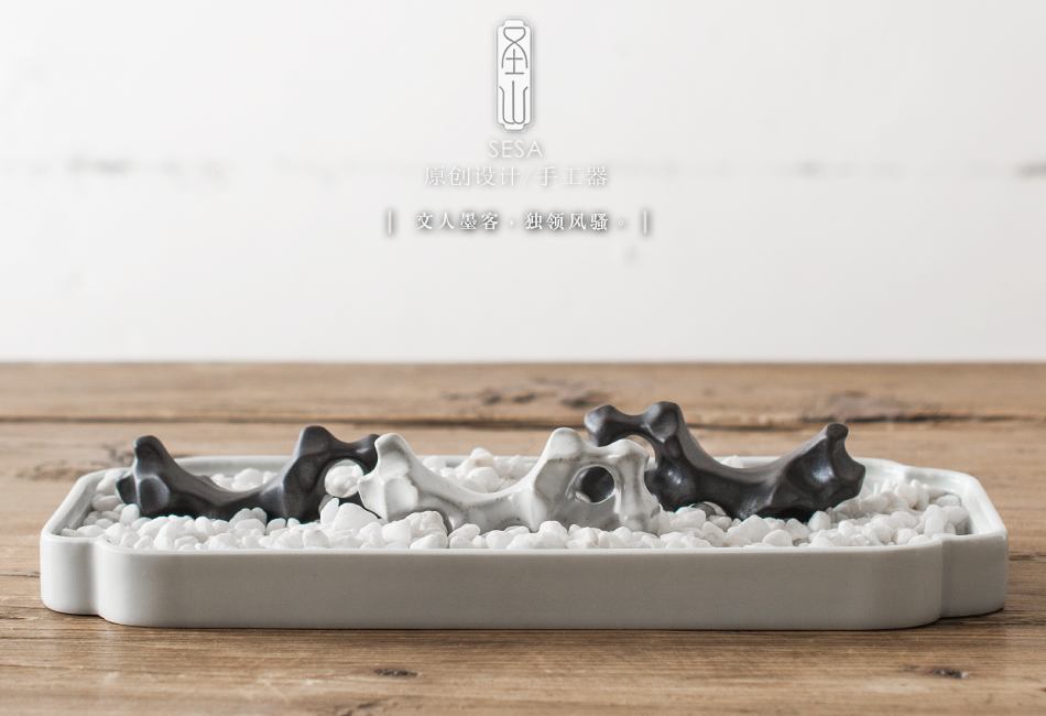 黑白一對圣山陶瓷太湖石假山石擺件水墨寫意茶寵文房筆架茶具配件盆景裝飾