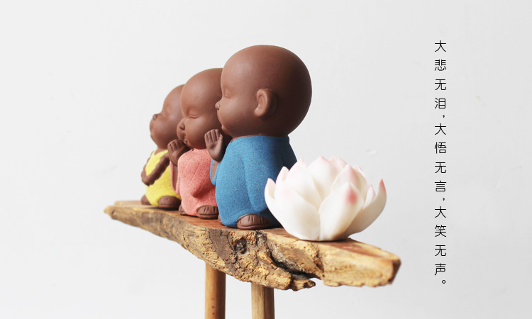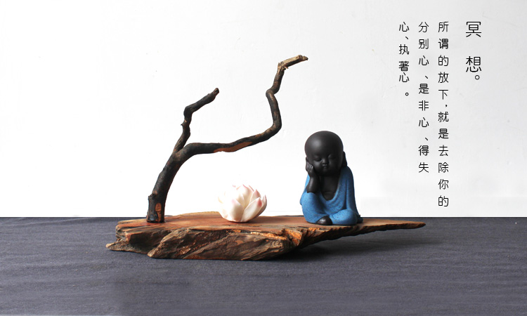 道禪(藍裟+木座+荷花香插)茶寵擺件小和尚彩砂小沙彌茶具茶道配件風化木家居擺件