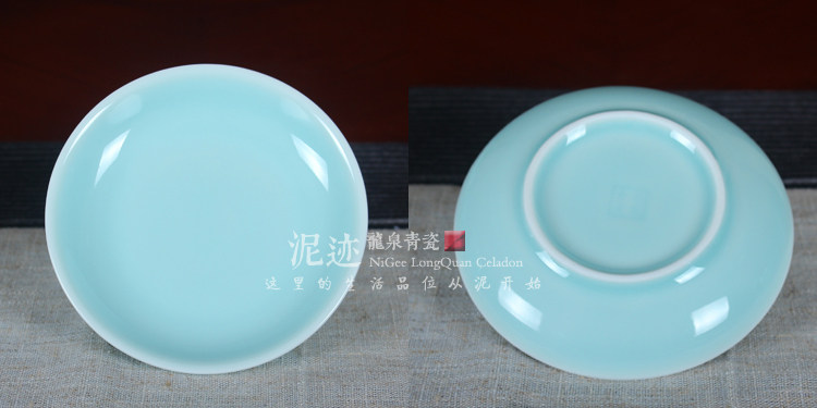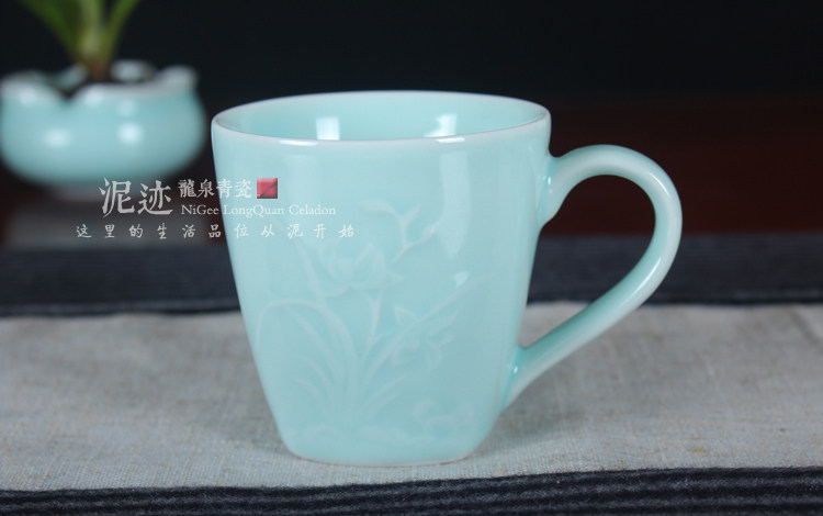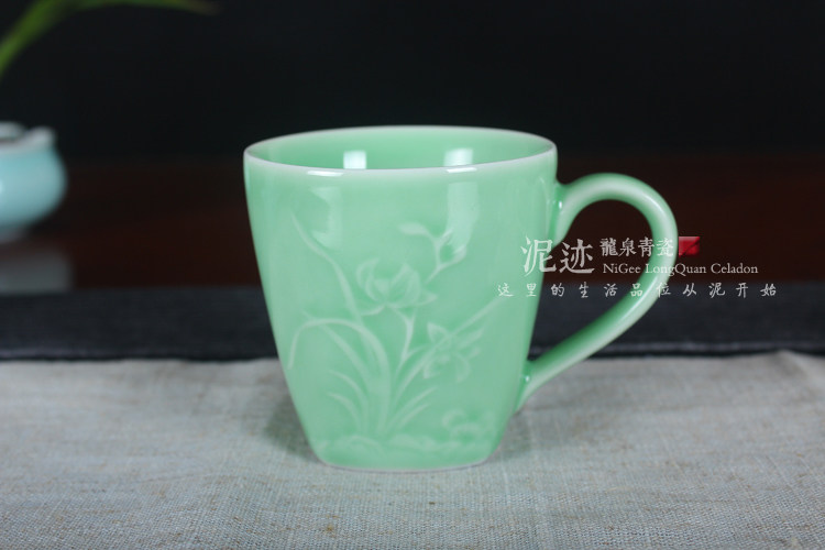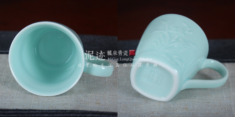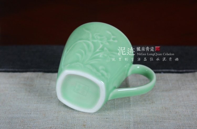 杯口圓潤,底部為方形設計,并帶有“龍泉青瓷”底款