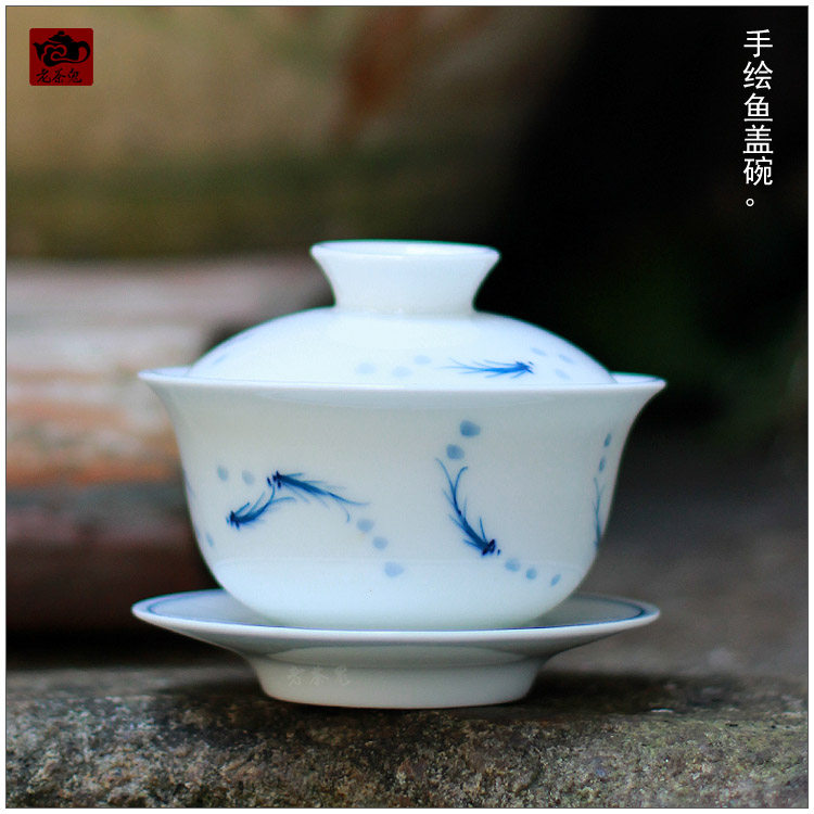 手繪魚公杯老茶鬼手繪魚戲陶瓷三才碗功夫茶具蓋碗敬茶杯茶備泡茶器三才杯