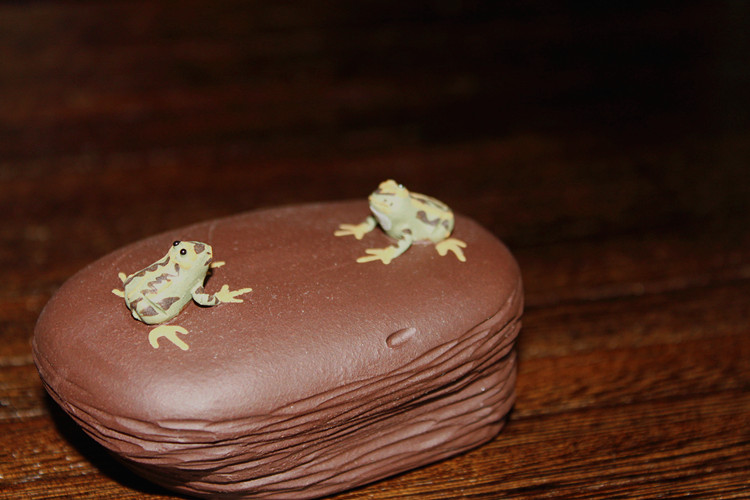 紫砂石頭小青蛙,可以噴水的茶寵擺件。整體寬度7.5cm,高度4cm。