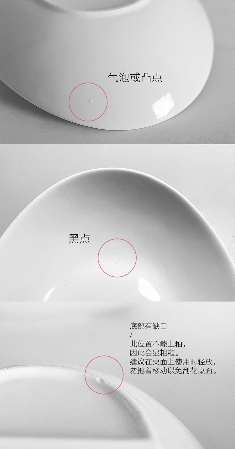 /黑點·氣泡/ 由于高溫燒制過程中瓷土的水分不均, 在收縮的時候有可能會出現下圖前兩種情況, 這都是國家標準允許的。但完美者不允許噢~ /底部缺口/ 由于陶瓷在燒制時底部與隔板相碰的地方是無法上釉, 因此造成少量磨損崩缺。 ![]() ![]() ![]() |
