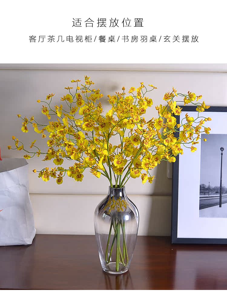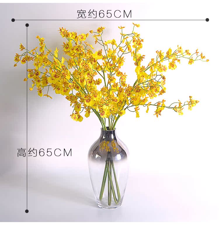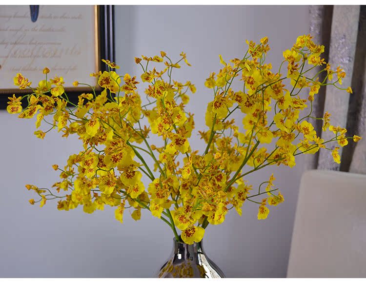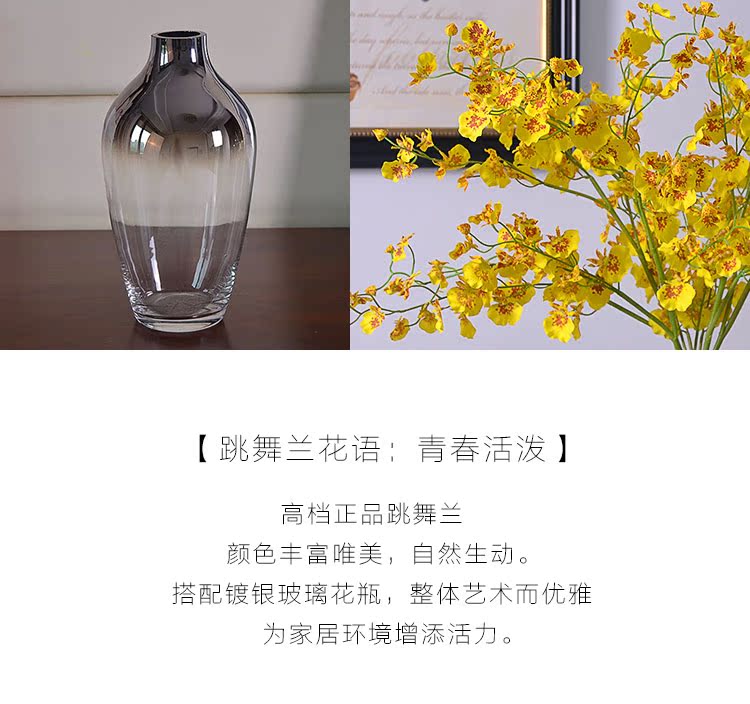 4支跳舞蘭+鍍銀玻璃花瓶(組合)品倫 黃色跳舞蘭花瓶花藝套裝文心蘭蝴蝶蘭假花 餐桌玄關擺放