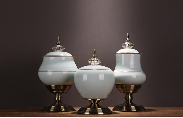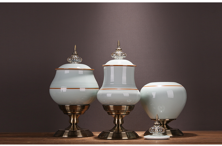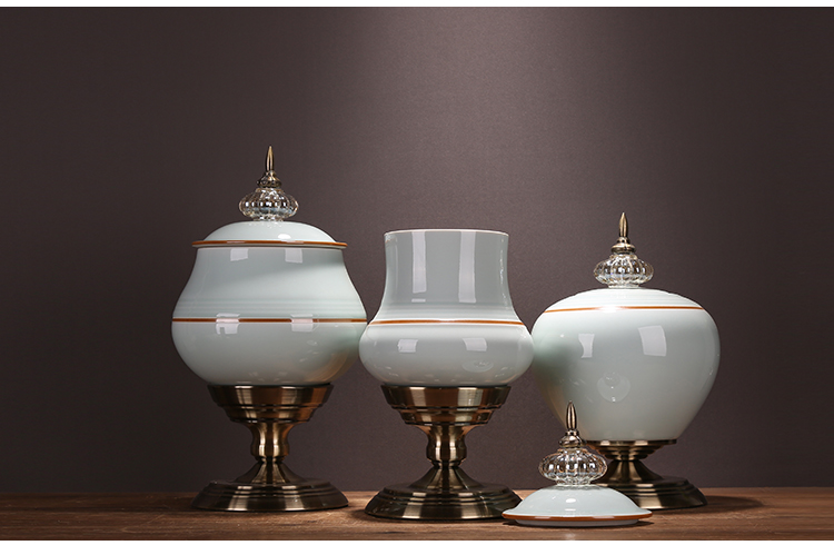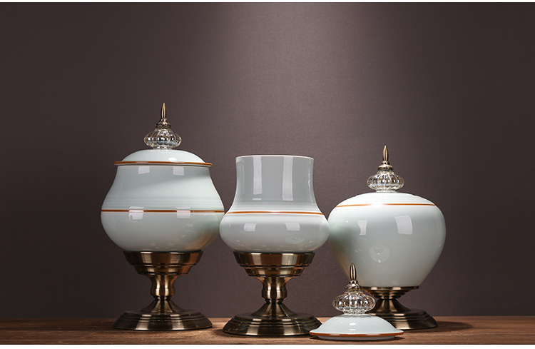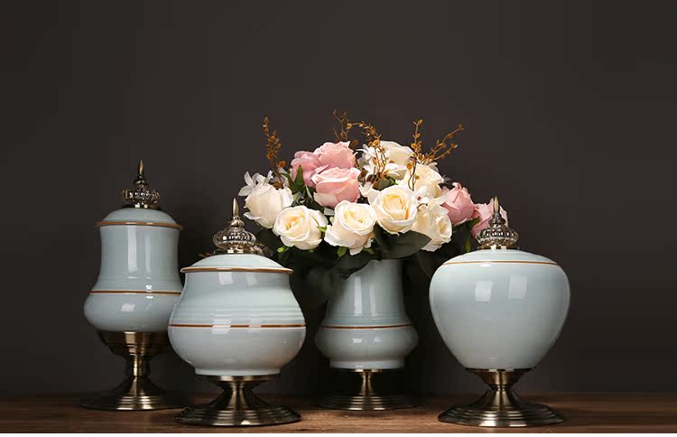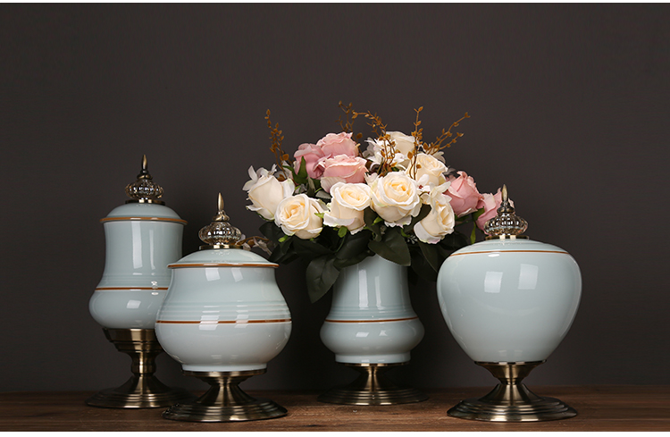 FL1216-1青色新古典陶瓷套裝合金擺件裝飾品儲物罐帶蓋大號插花樣板房客廳玄關
